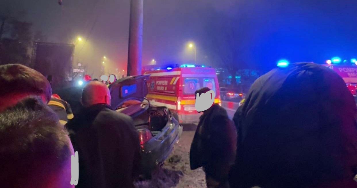 În mașină se aflau două persoane. Una a reușlit să iasă singură, cealaltă era încarcerată.