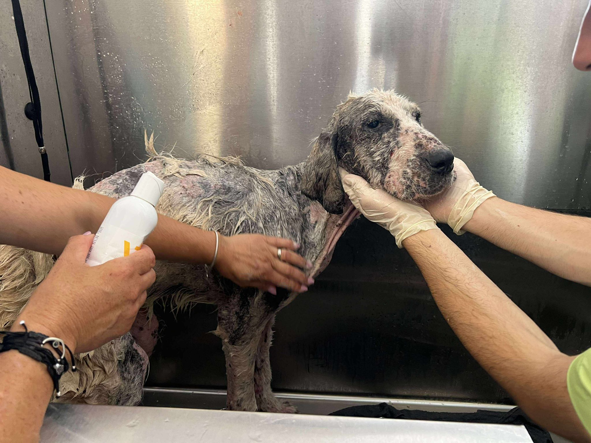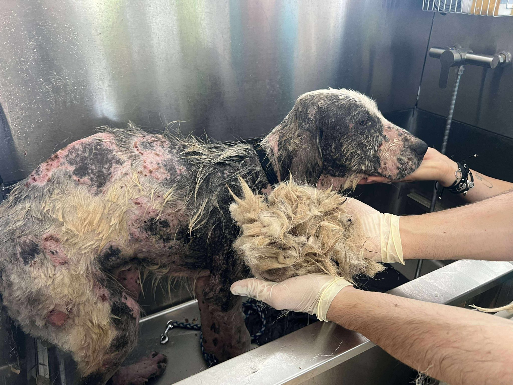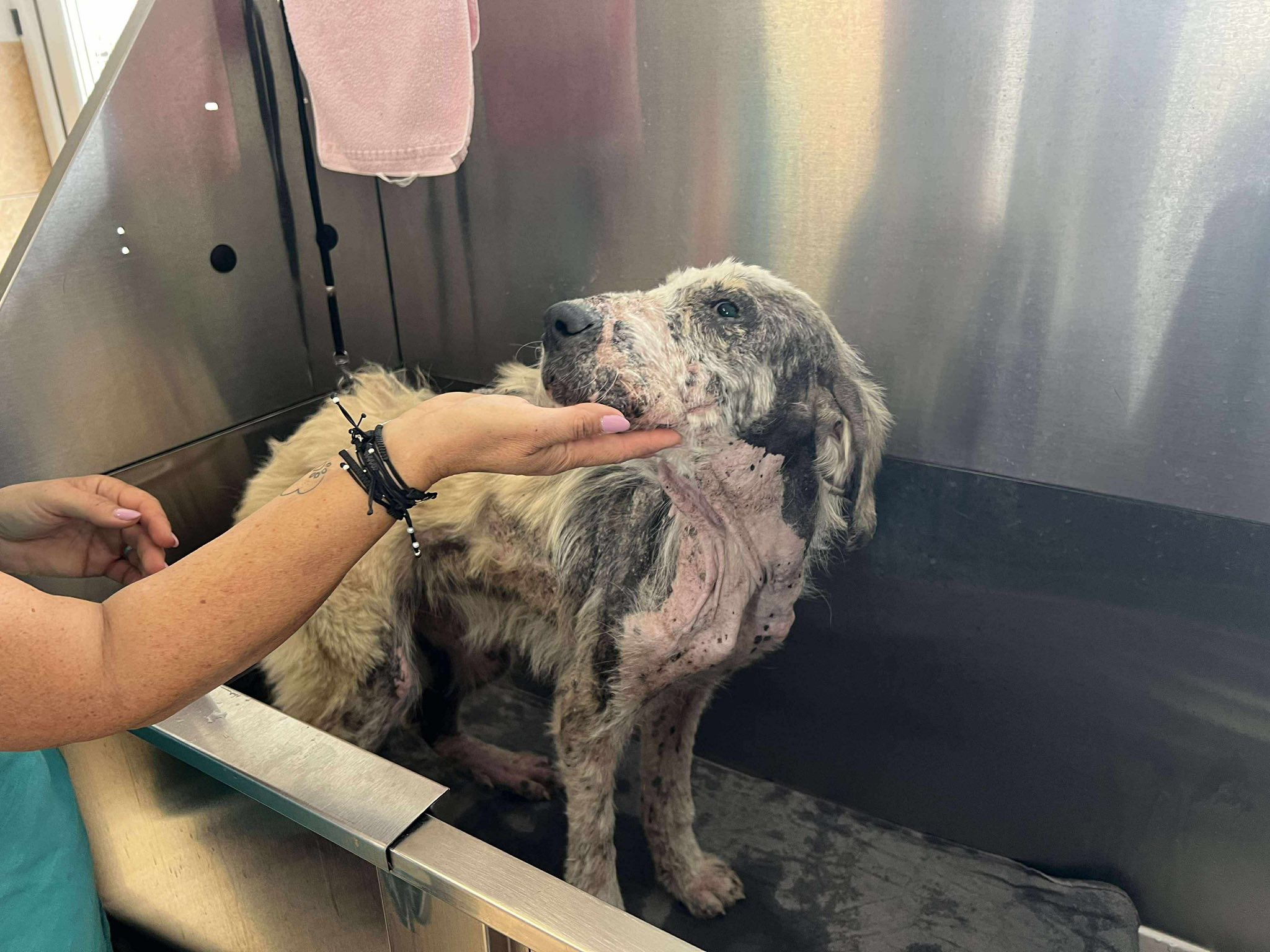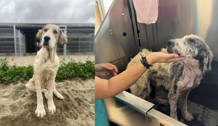 ”Fina, o cățelușă de doar un an, a ajuns la noi cu probleme grave de piele cauzate de demodex, un parazit care i-a provocat mult disconfort și durere.