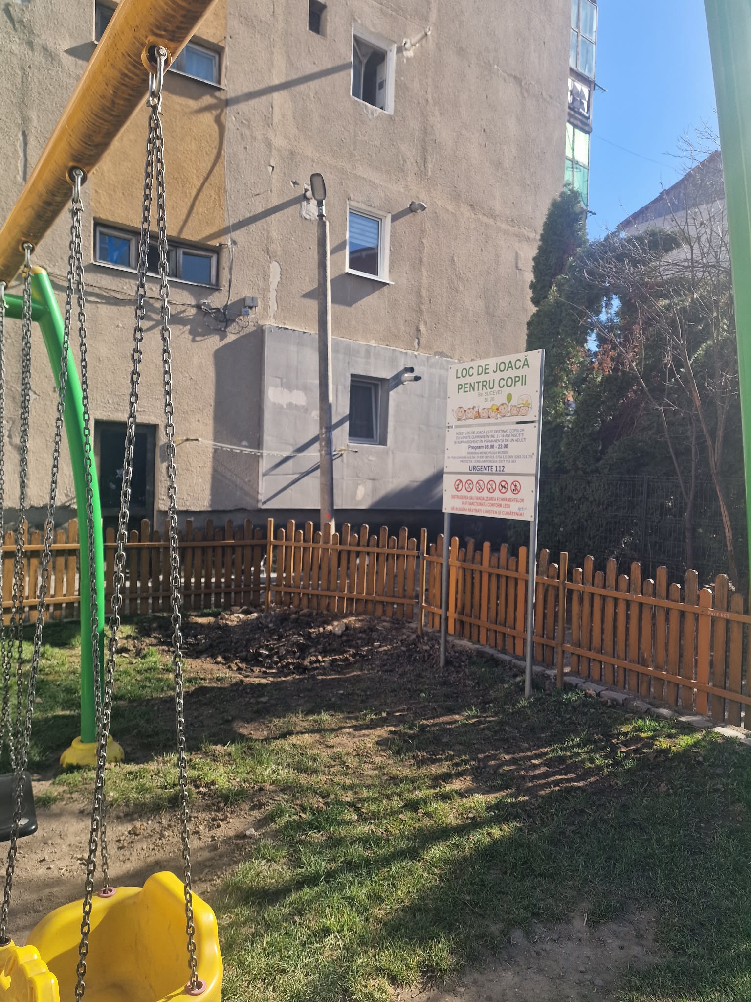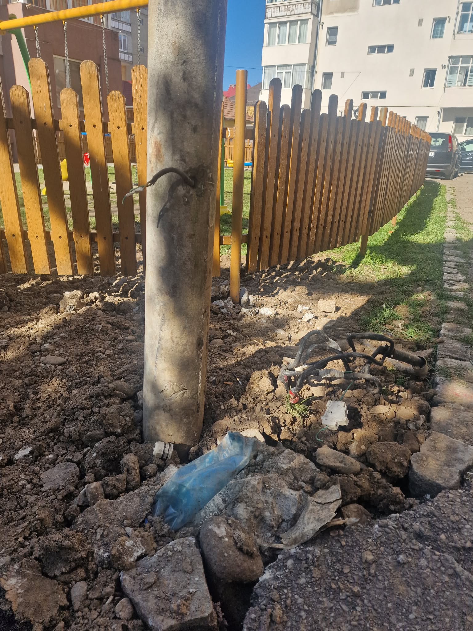 Un stâlp de iluminat amplasat la spațiul de joacă de pe strada Bârgăului ”oferă” copiilor lecția despre firele electrice. Acestea sunt lăsate de izbeliște, așa că părinții sunt nevoiți să îi păzească pe cei mici să nu pățească ceva.