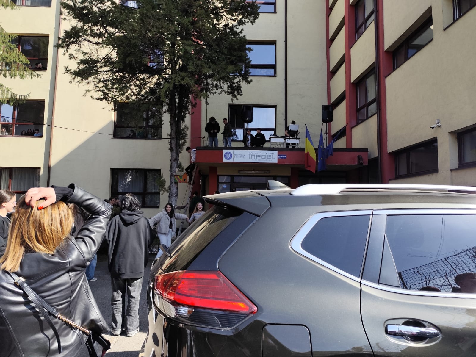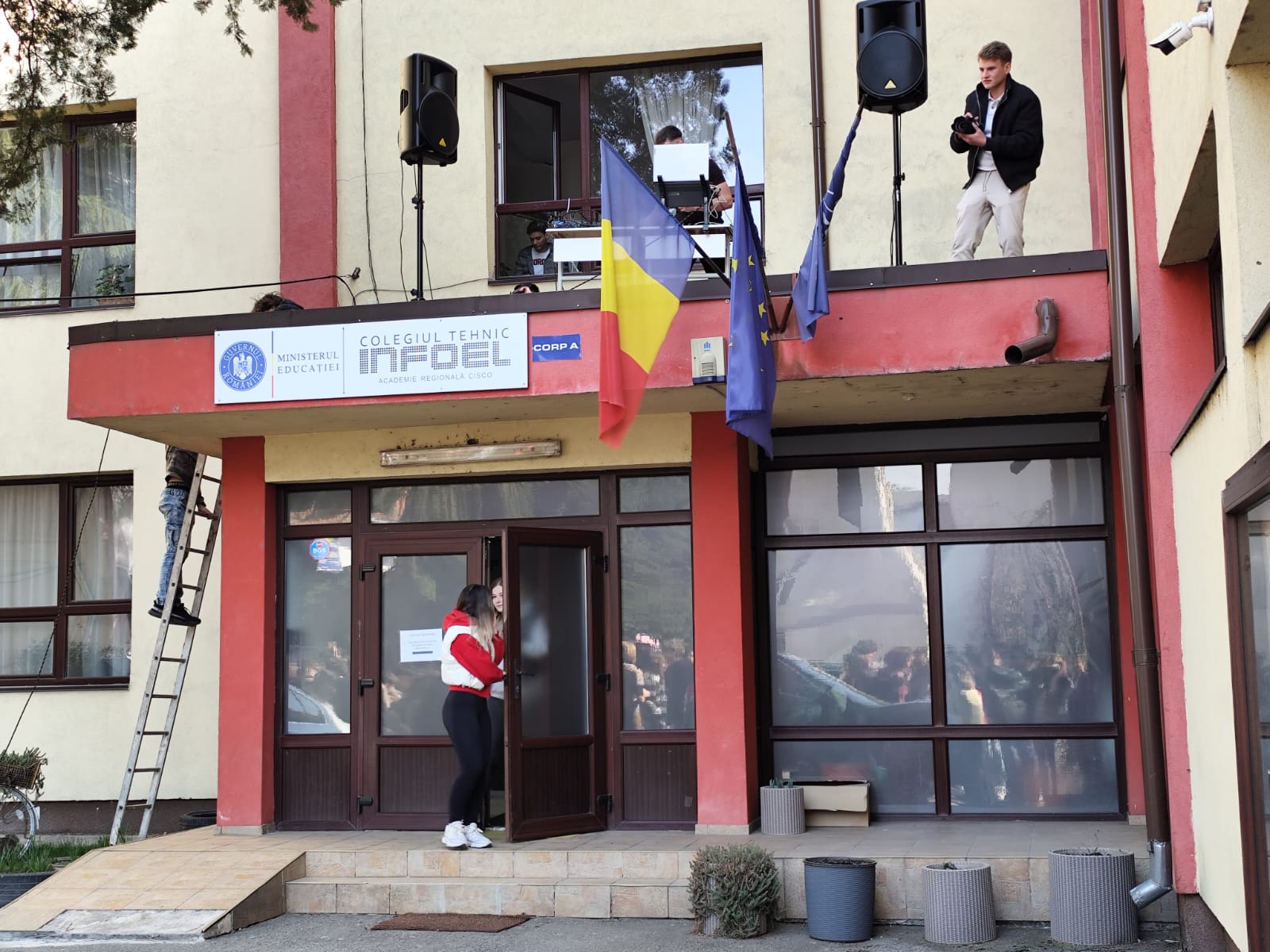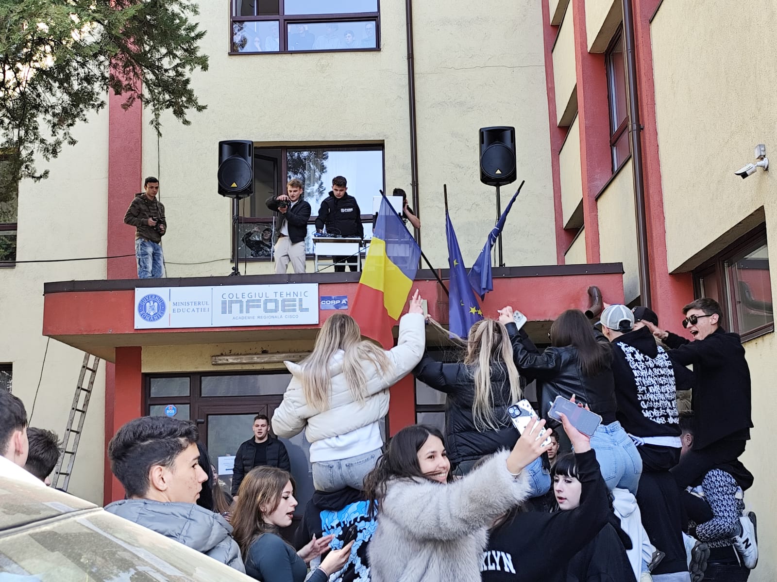 Astăzi, în pauza mare, a răsunat muzica în curtea INFOEL. Pe plafonul aflat deasupra intrării în clădirea școlii, mai mulți elevi au instalat boxe și o stație muzicală.