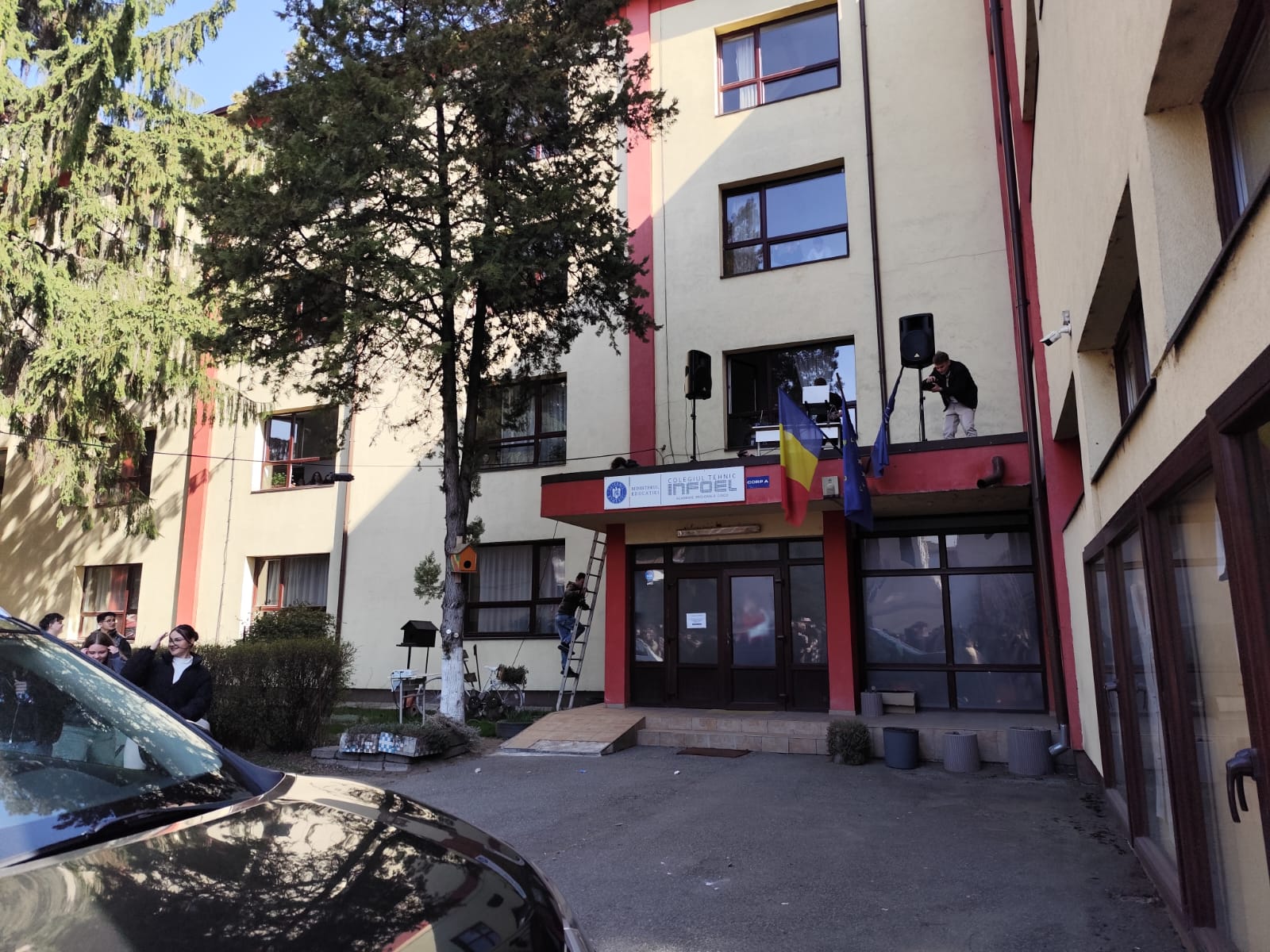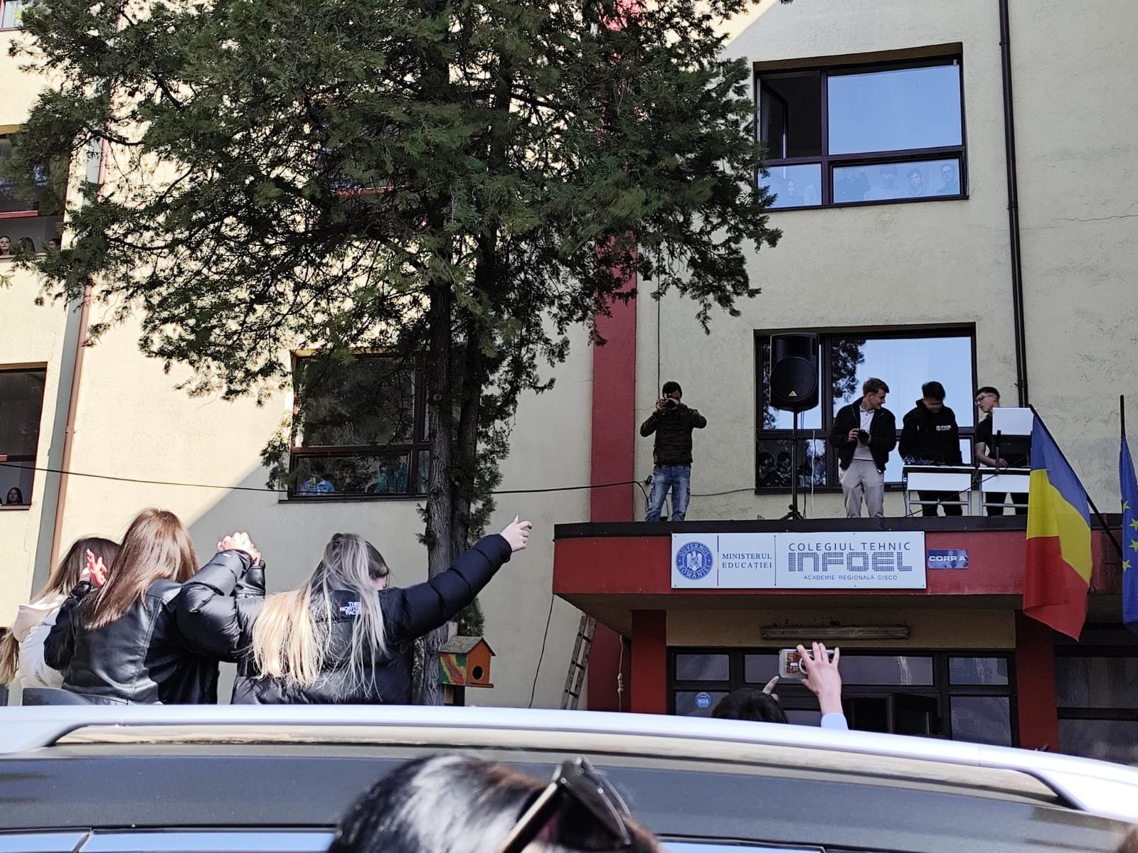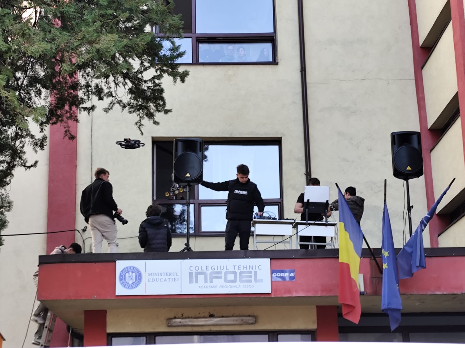 Astăzi, în pauza mare, a răsunat muzica în curtea INFOEL. Pe plafonul aflat deasupra intrării în clădirea școlii, mai mulți elevi au instalat boxe și o stație muzicală.