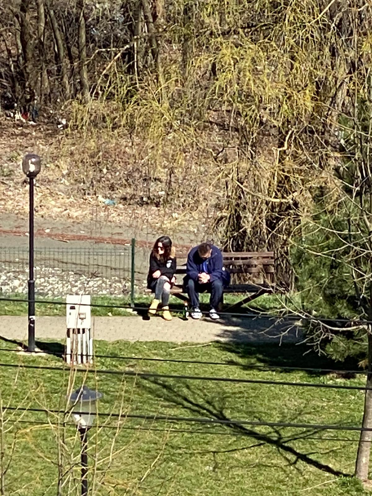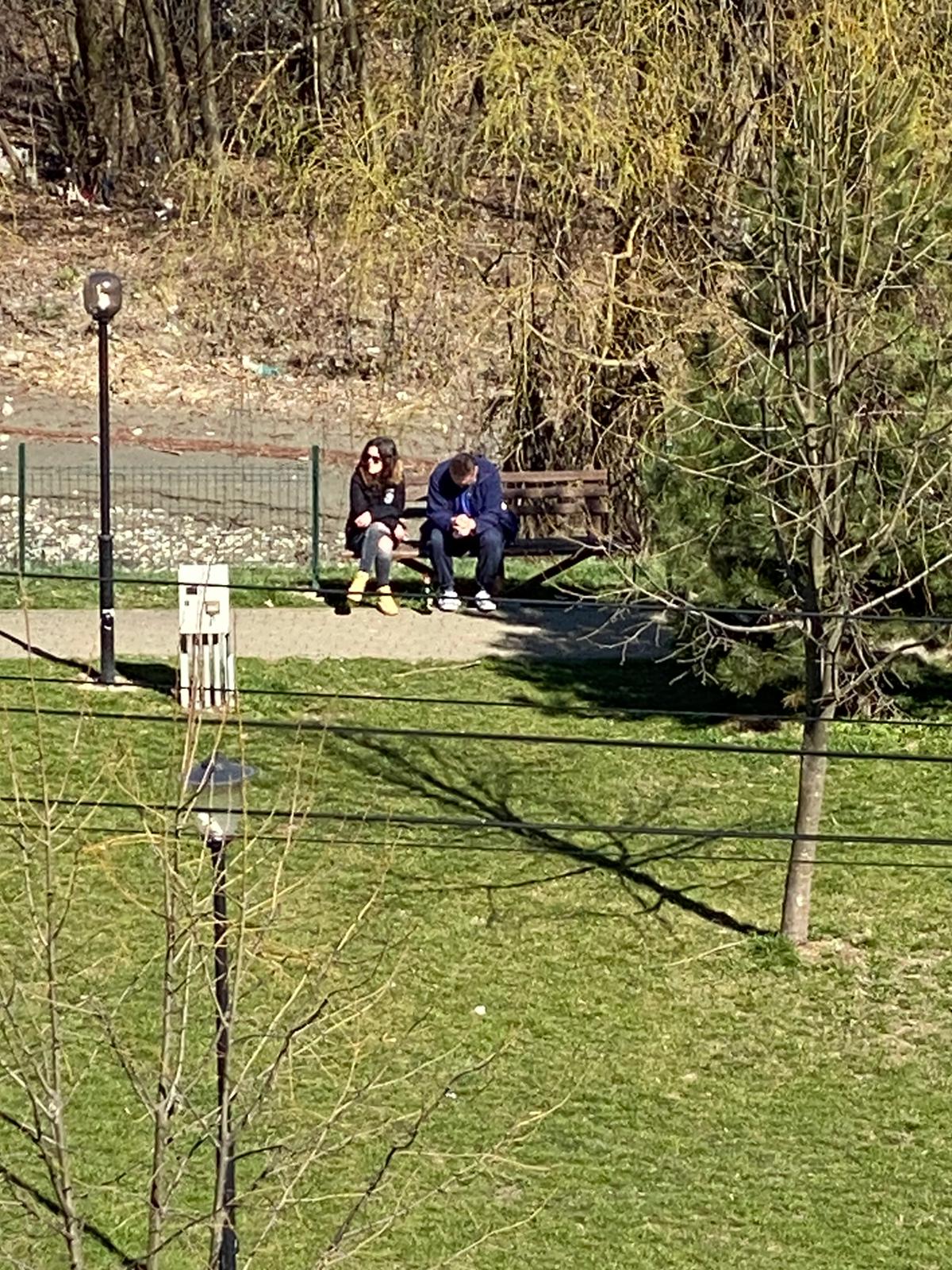 Așa că cei doi au stat frumos pe o bancă timp de mai bine de două ore, sub privirile disperate ale unui cetățean cinstit, aflat în izolare.