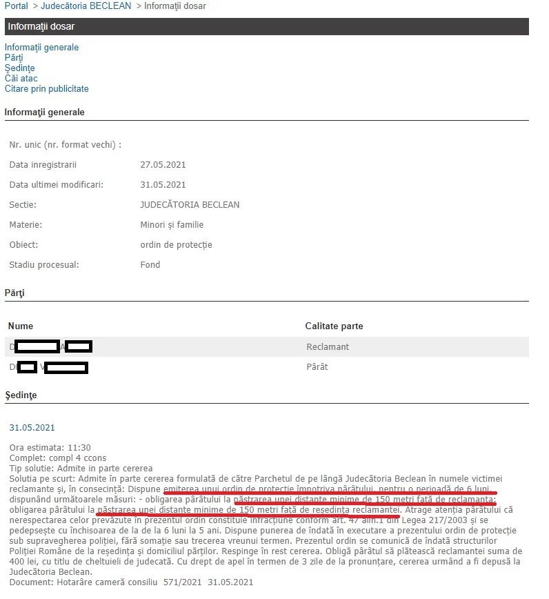 Ieri, judecătorii din Beclean au dispus emiterea unui ordin de protecție pe o perioadă de 6 luni de zile.