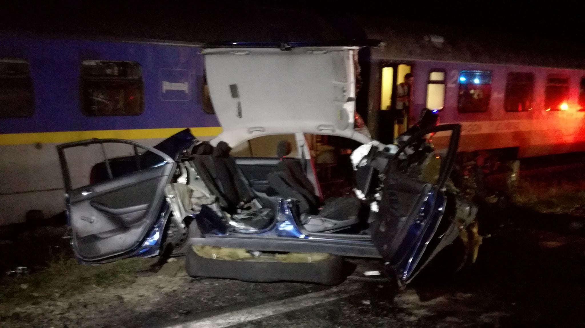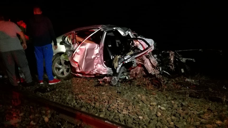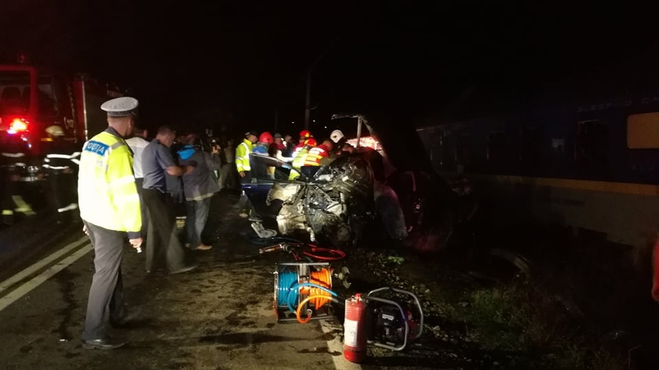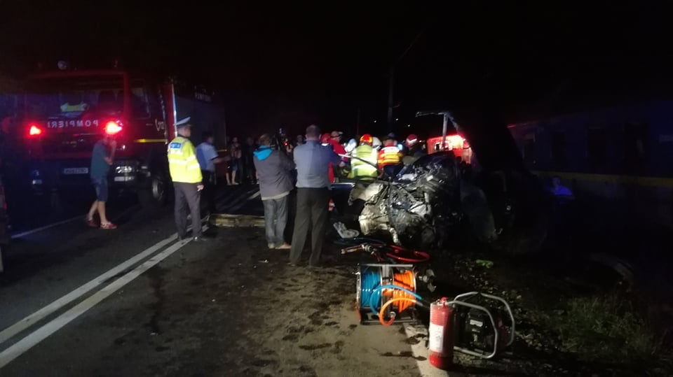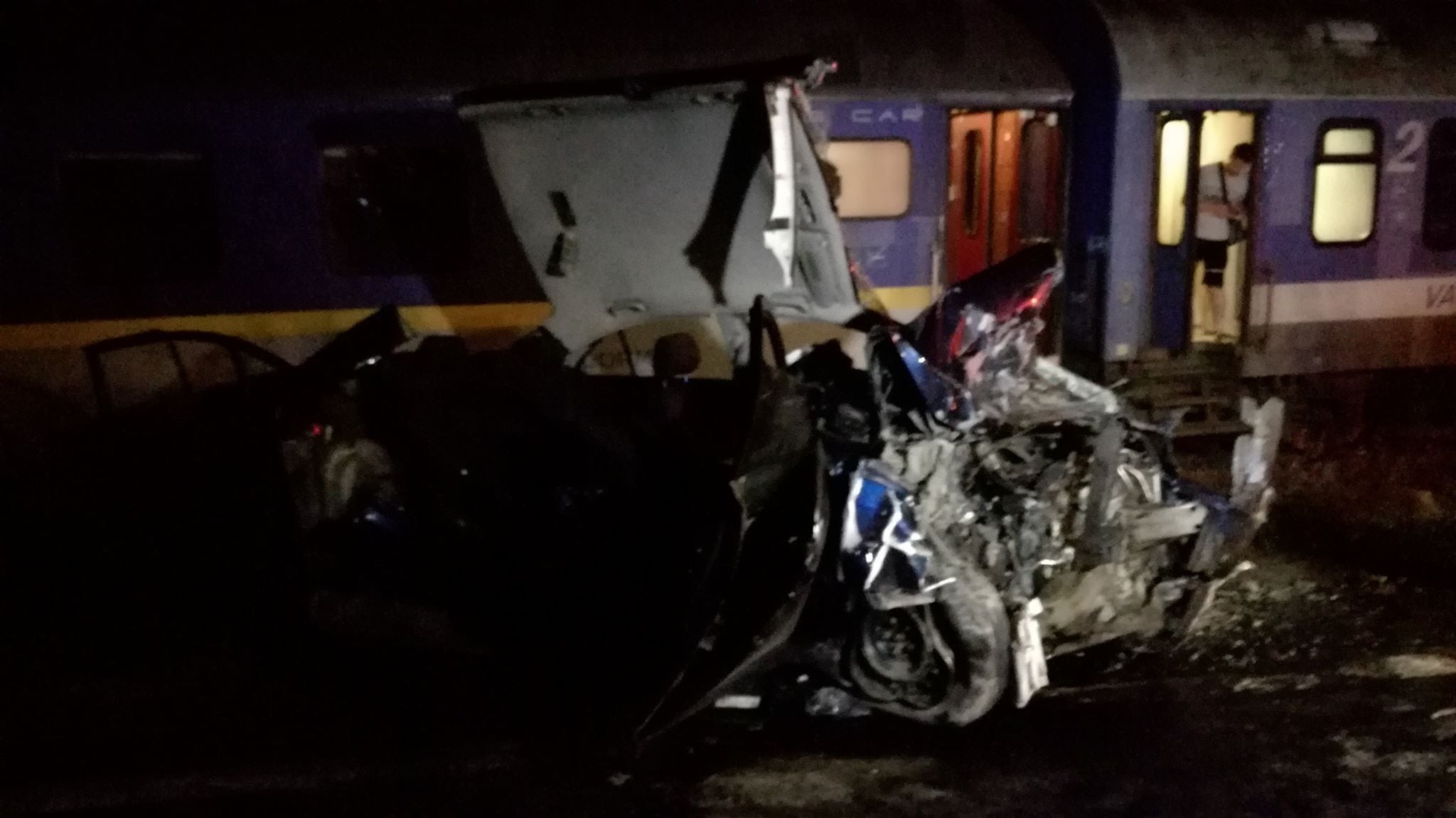 Două autoturisme au colizionat. În urma impactului, una dintre acestea a ajuns pe calea ferată, unde a fost lovită de locomotiva unui tren de persoane.