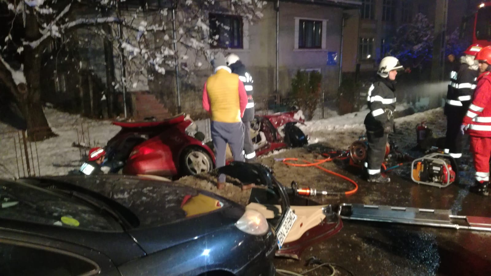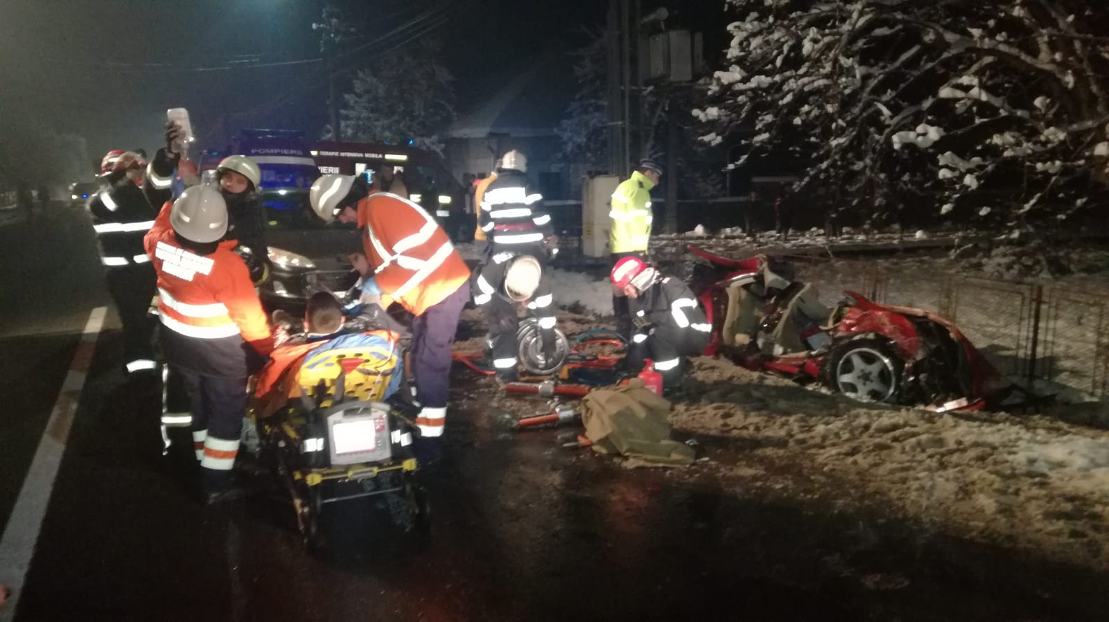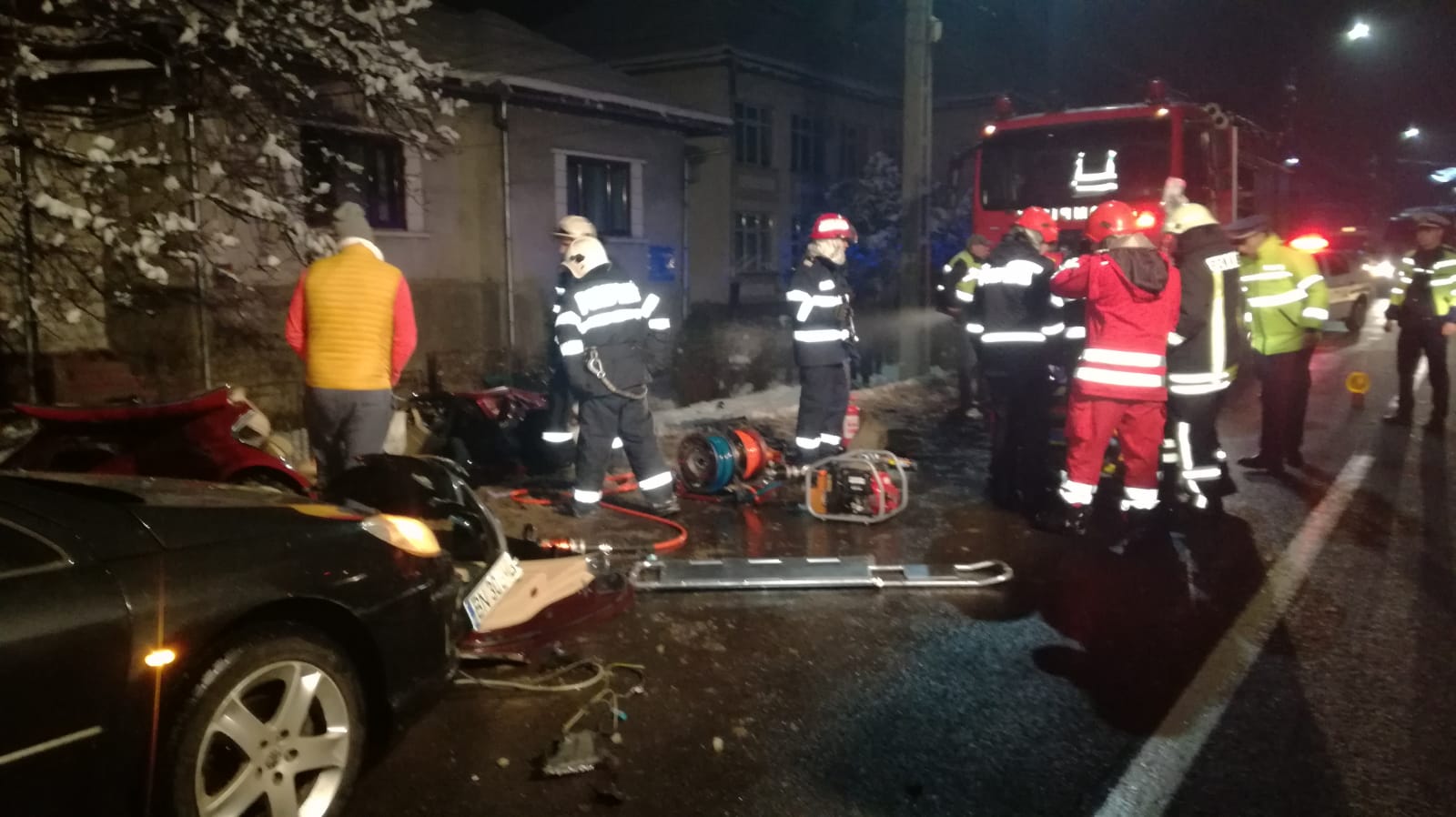 În urma impactului, unul dintre autoturisme a fost aruncat în șanțul de pe marginea drumului, iar două persoane au rămas încarcerate, una sub bord, iar alta nu a putut să deschidă ușa din cauza șanțului.