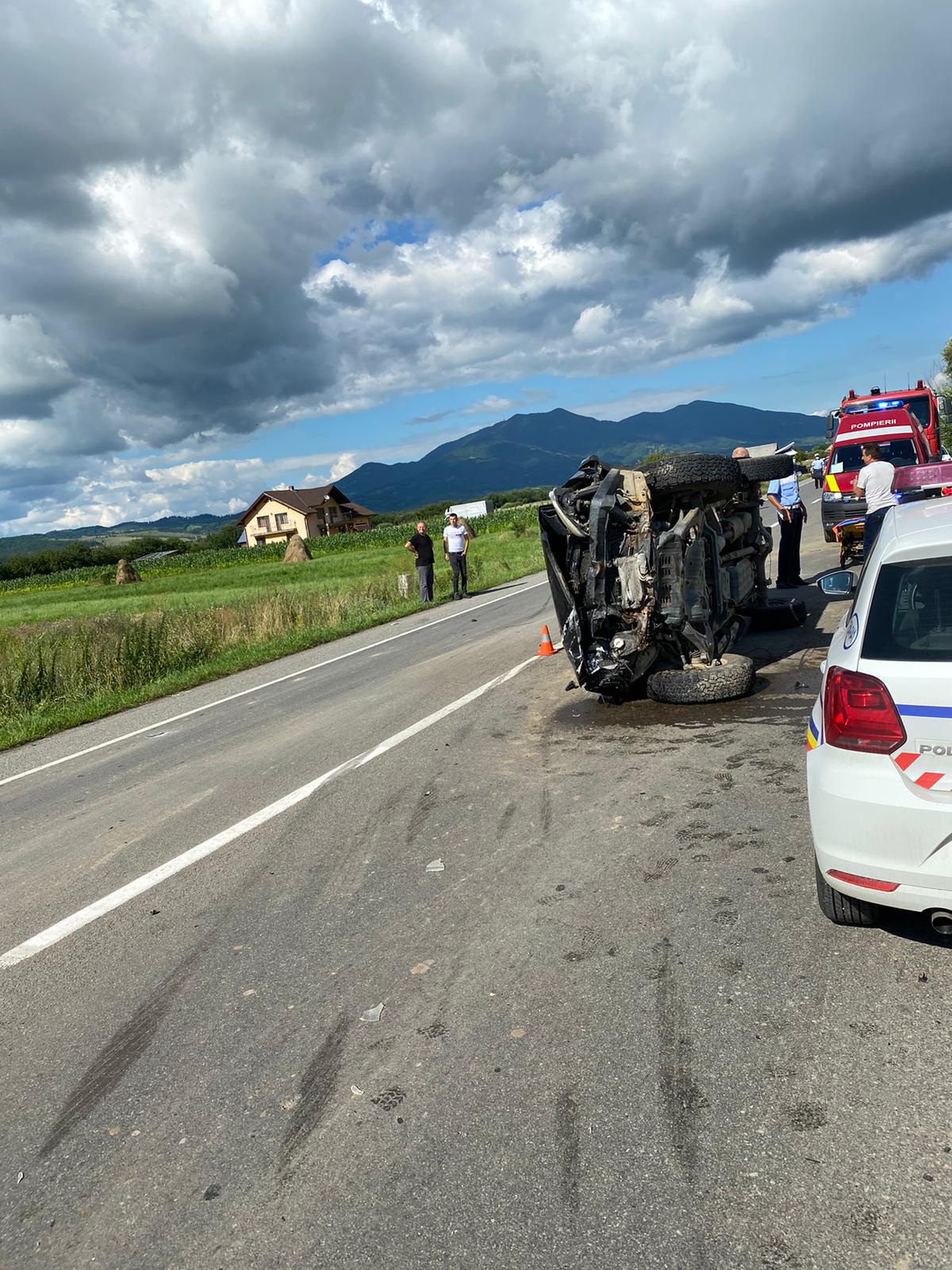 Două mașini au colizionat în Rusu Bârgăului. În urma impactului una dintre ele s-a răsturnat pe carosabil, iar cealaltă a ajuns în câmp.