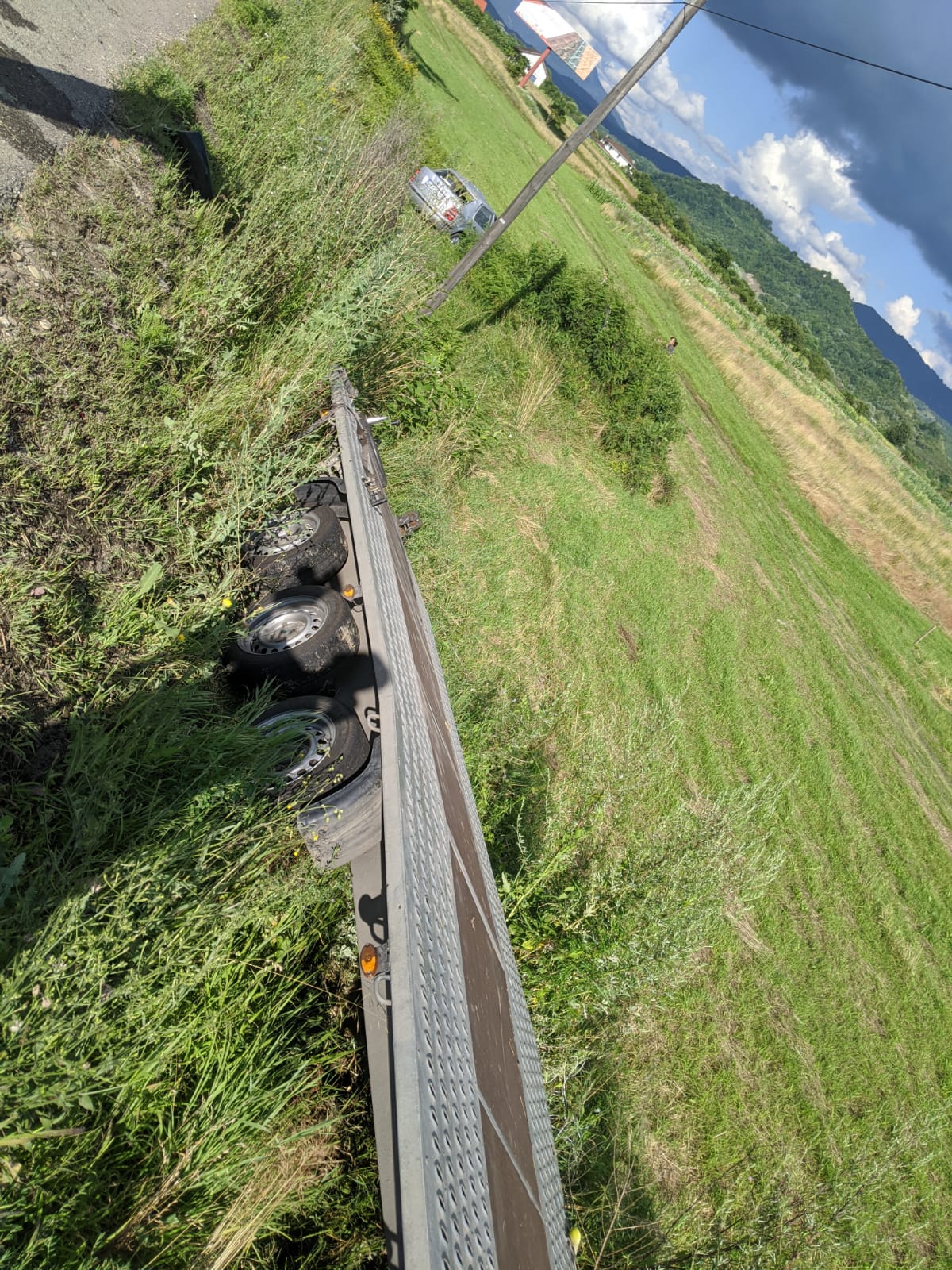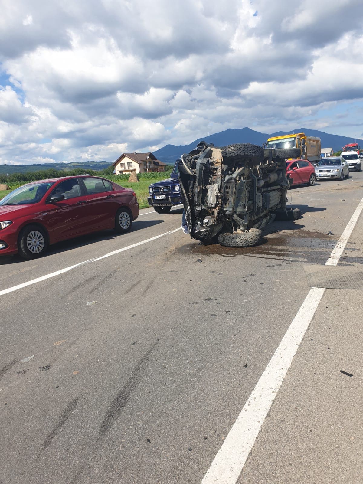 Conform informațiilor, mașina răsturnată pe carosabil circula pe direcția Rusu Bârgăului – Bistrița și avea atașată o platformă pe care transporta o camionetă. La un moment dat, camioneta s-ar fi balansat pe platformă, și s-a răsturnat pe partea dreaptă a carosabilului, moment în care a surprins și acroșat o mașină înmatriculată în județul Suceava.