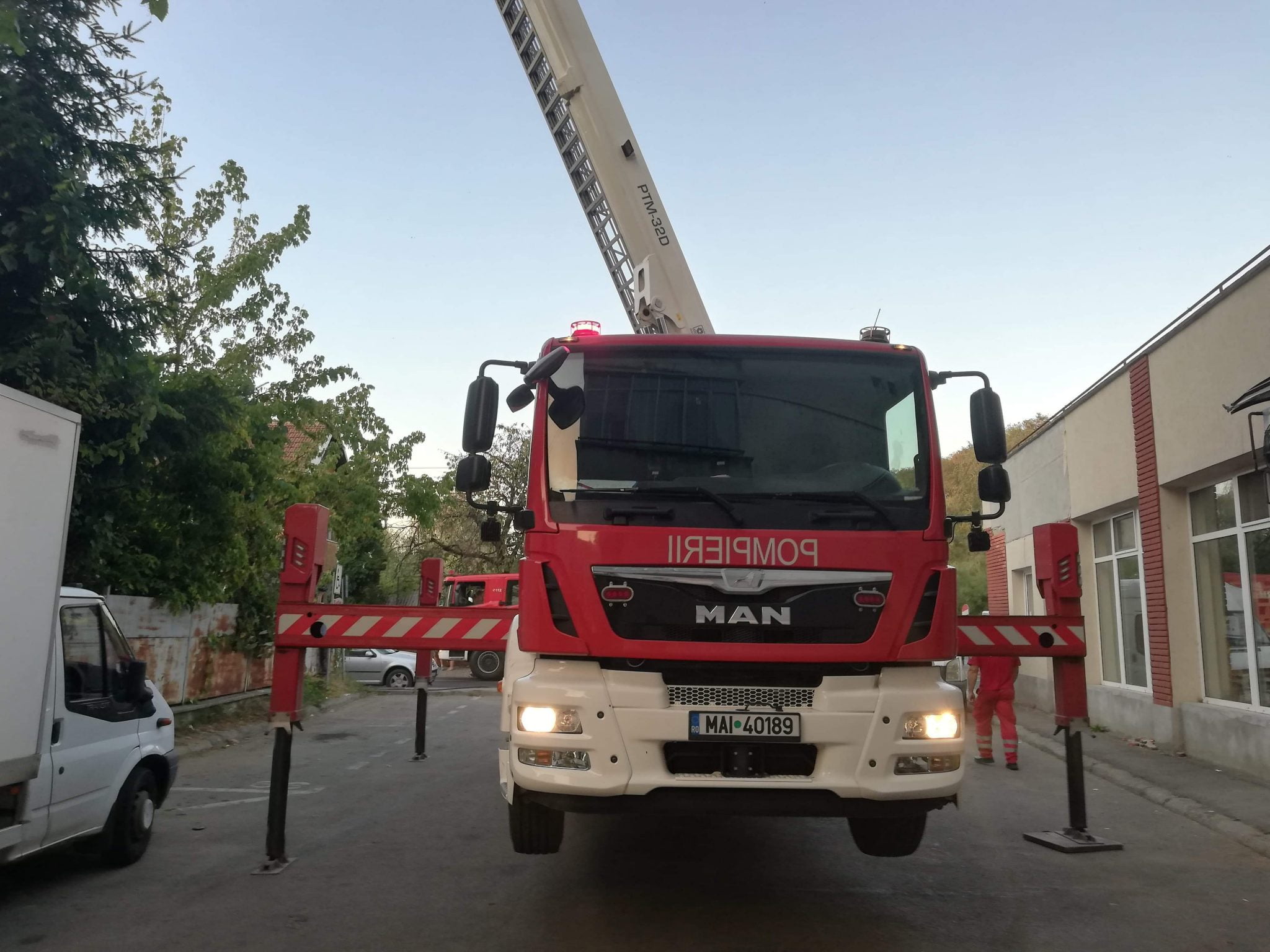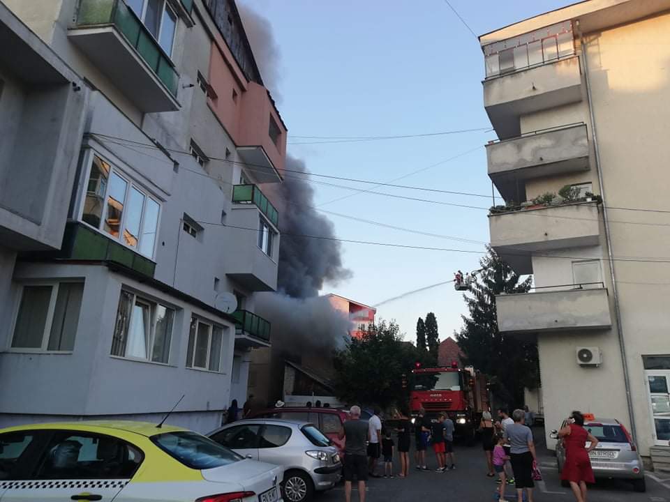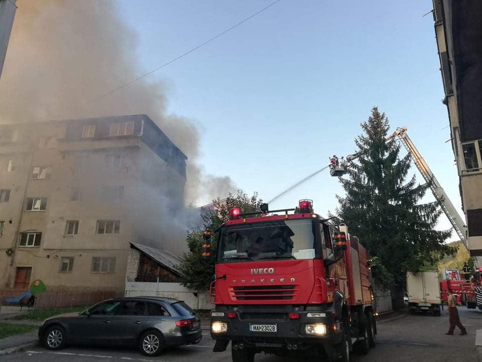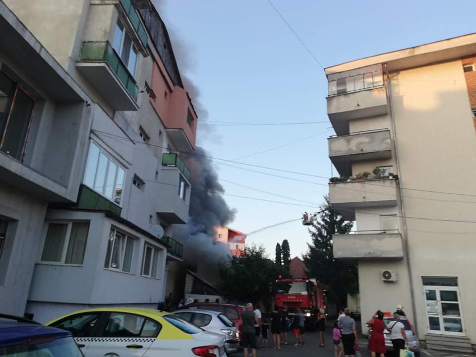 Pompierii intervin pentru stingerea incendiului atât de jos, cât și de la înălțime.