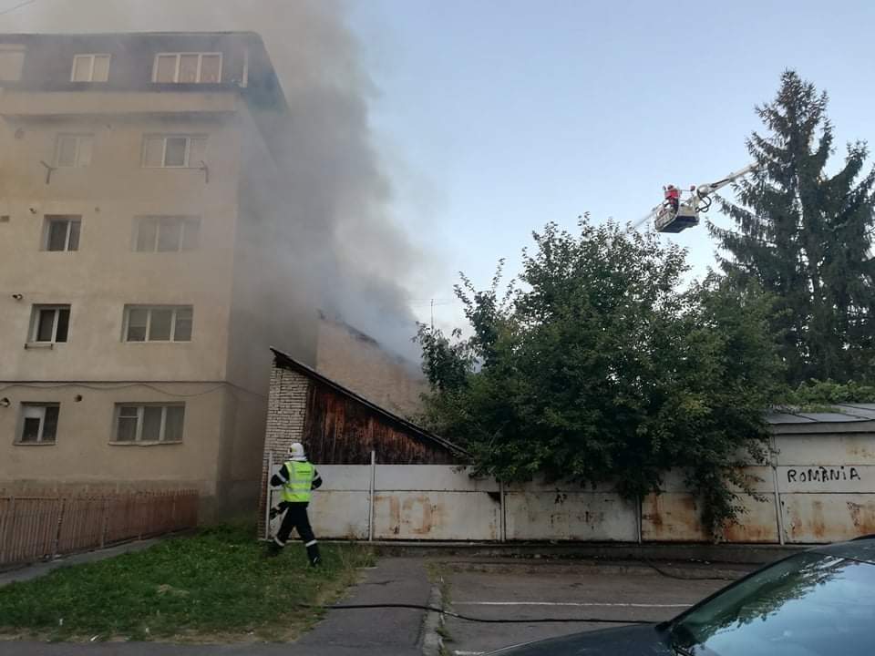 Un bar abandonat din zona Ștefan cel Mare a fost cuprins de flăcări. Pompierii intervin pentru stingerea incendiului de jos, dar și de la înălțime. O casă din apropiere a fost inundată cu fum.