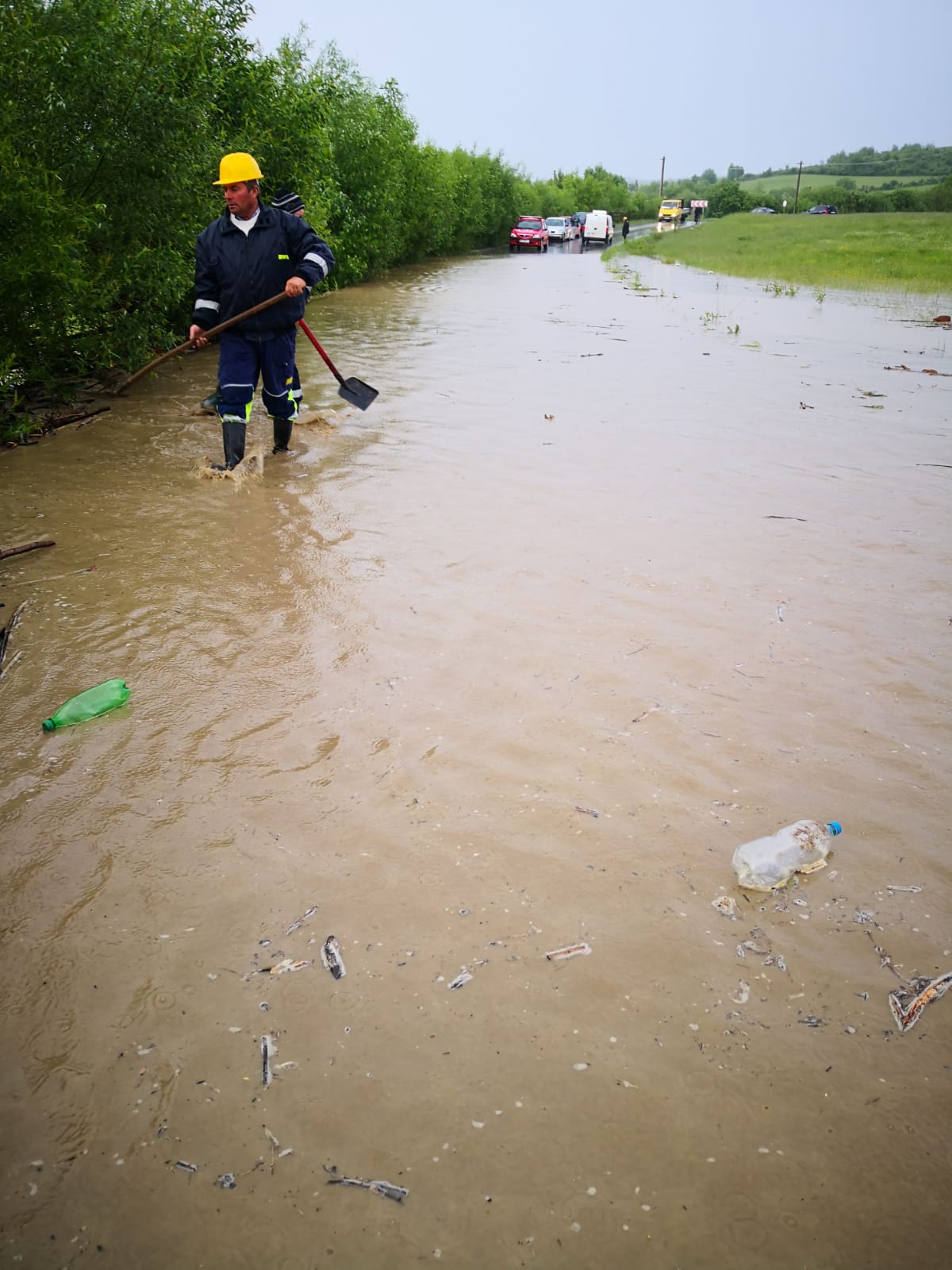 Coloana de mașini formată din cauza drumului inundat dintre Feldru și Nepos, se mișcă încet. De curând au dat voie și mașinilor mari să treacă prin zonă.