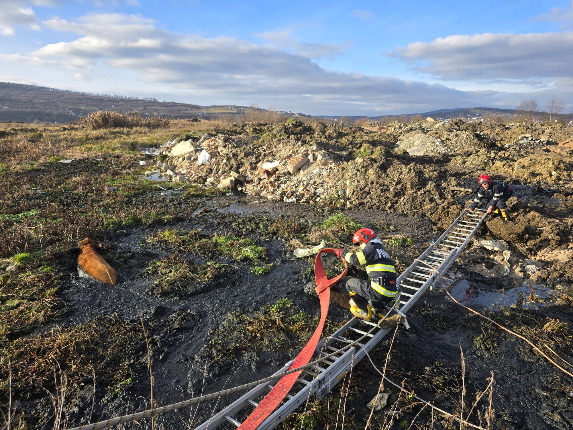 Echipajele de la ISU Bistrița-Năsăud și Serviciul Voluntar pentru Situații de Urgență (SVSU) Bistrița au fost alertate cu privire la faptul că animalelor nu mai puteau ieși singure din noroiul adânc.