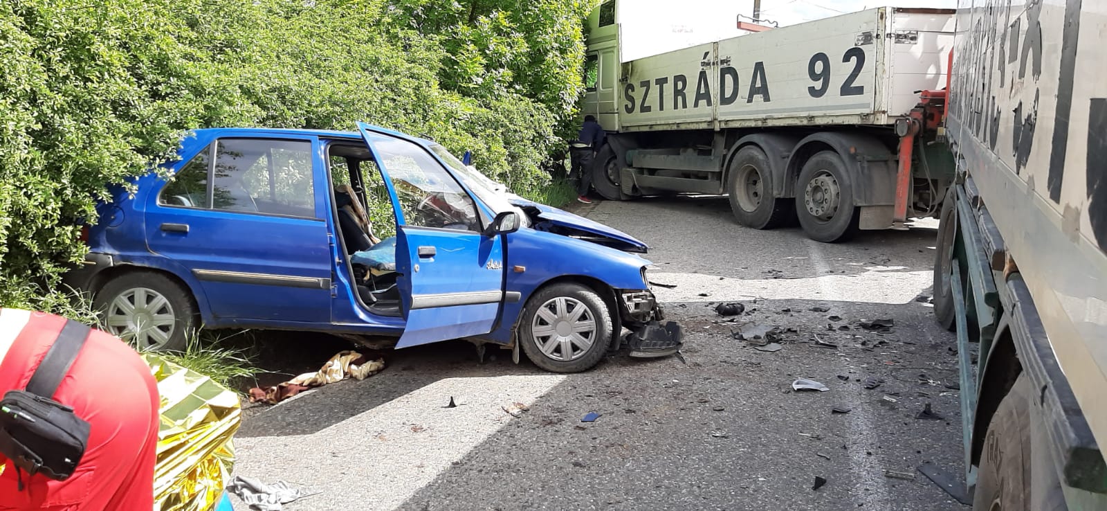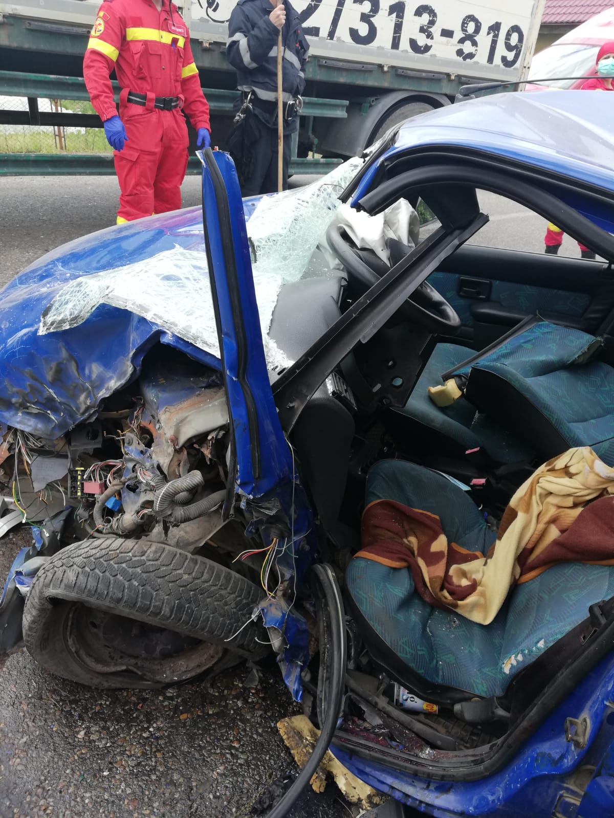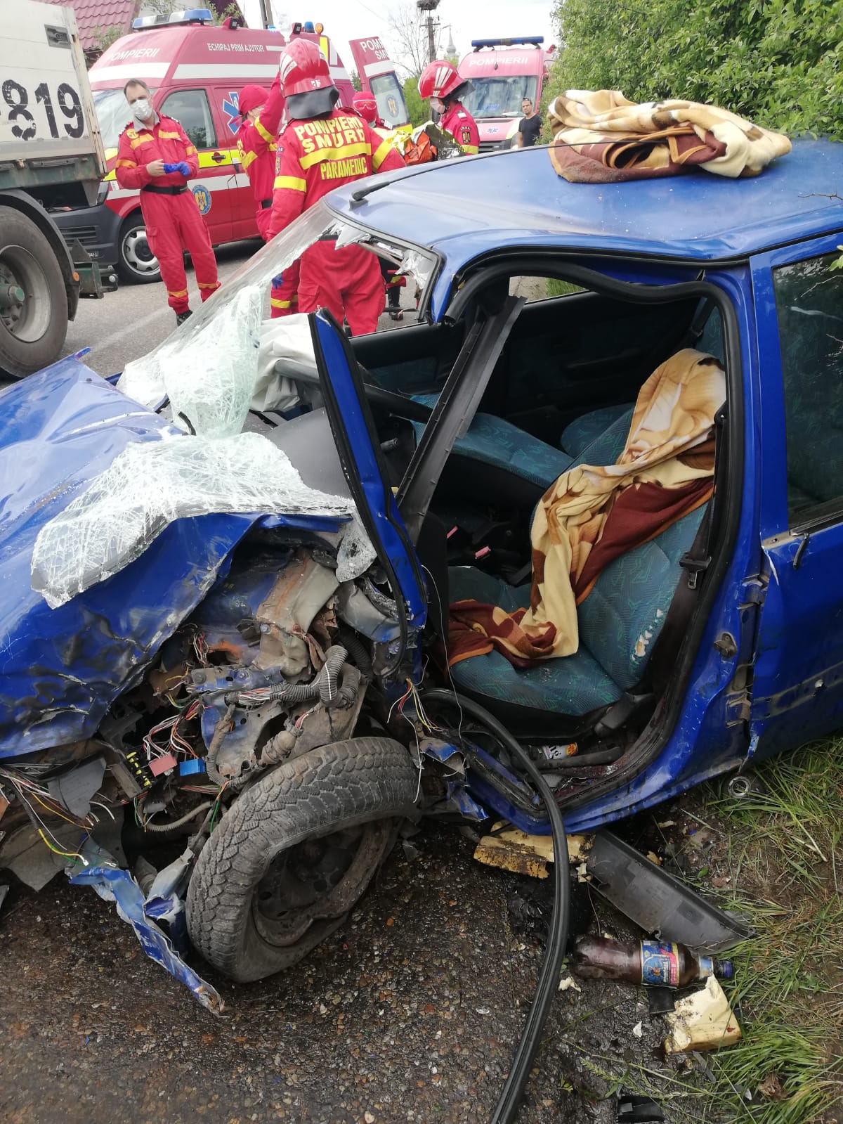 „Bărbatul în vârstă de aproximativ 60 de ani a fost extras din autoturism de către pompierii militari și predat, succesiv, echipajelor medicale SMURD, de prim ajutor, respectiv de terapie intensivă mobilă. Victima este conștientă, cooperantă, politraumatizată, suspiciune de fractura la nivelul unui membru inferior. A fost stabilizată de echipajele medicale și urmează să fie predată elicopterului SMURD care va ateriza în apropierea locului producerii accidentului. Intervenția este în dinamică”, transmit reprezentanții ISU BN.