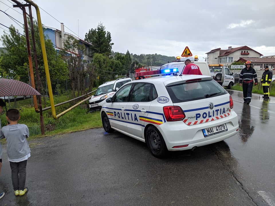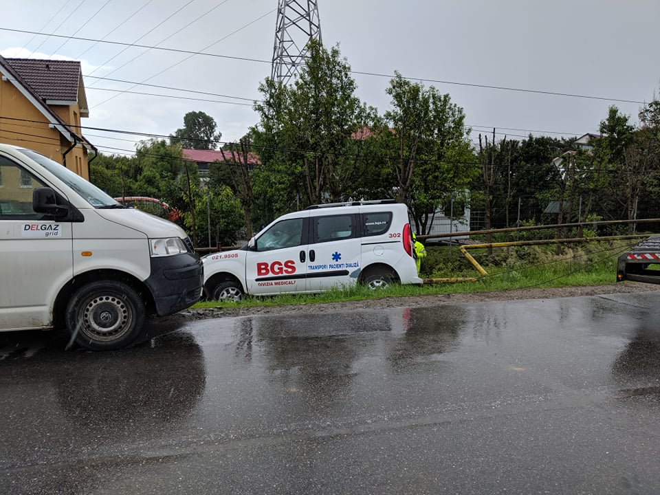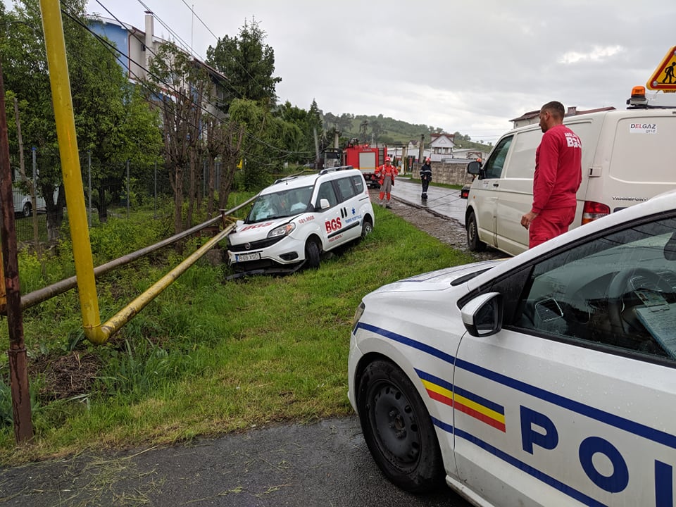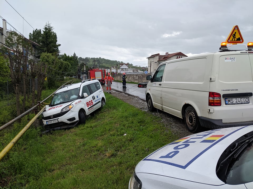 Un accident rutier a avut loc în urmă cu puțin timp pe strada Tărpiului. O mașină aparținând BGS, devizia medicală, a ajuns într-un șanț, fisurând și o țeavă de gaz.