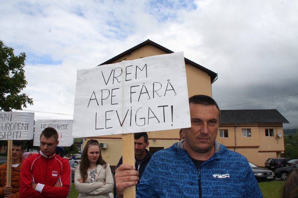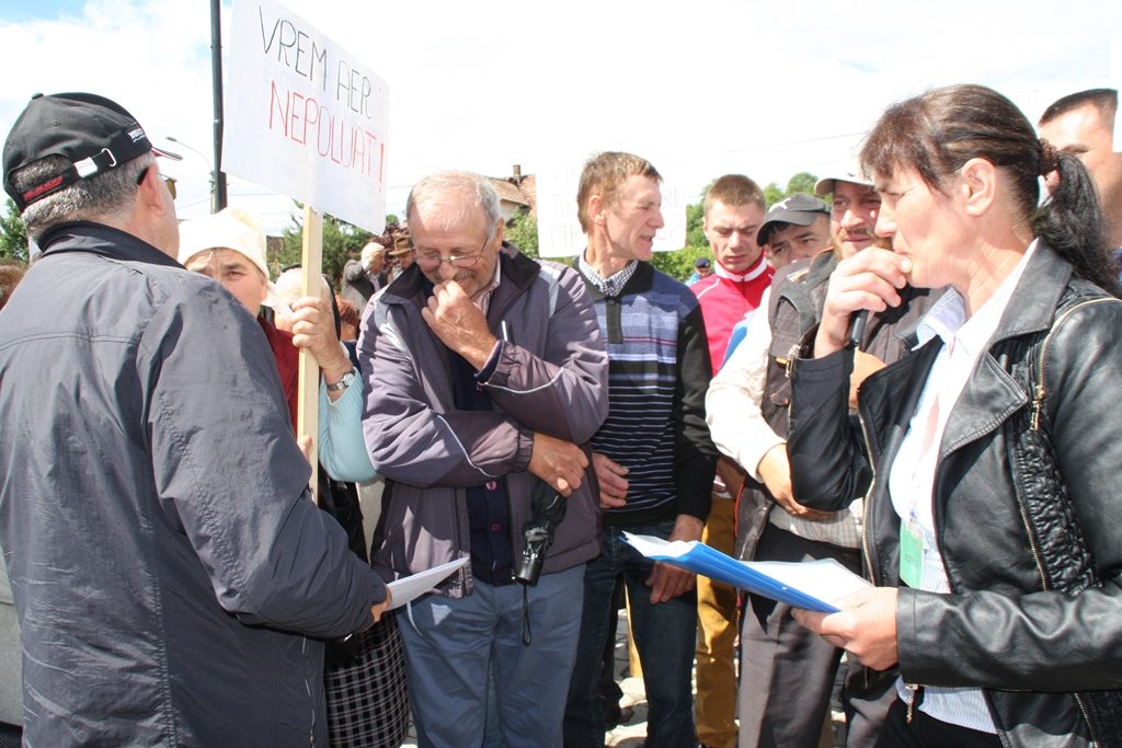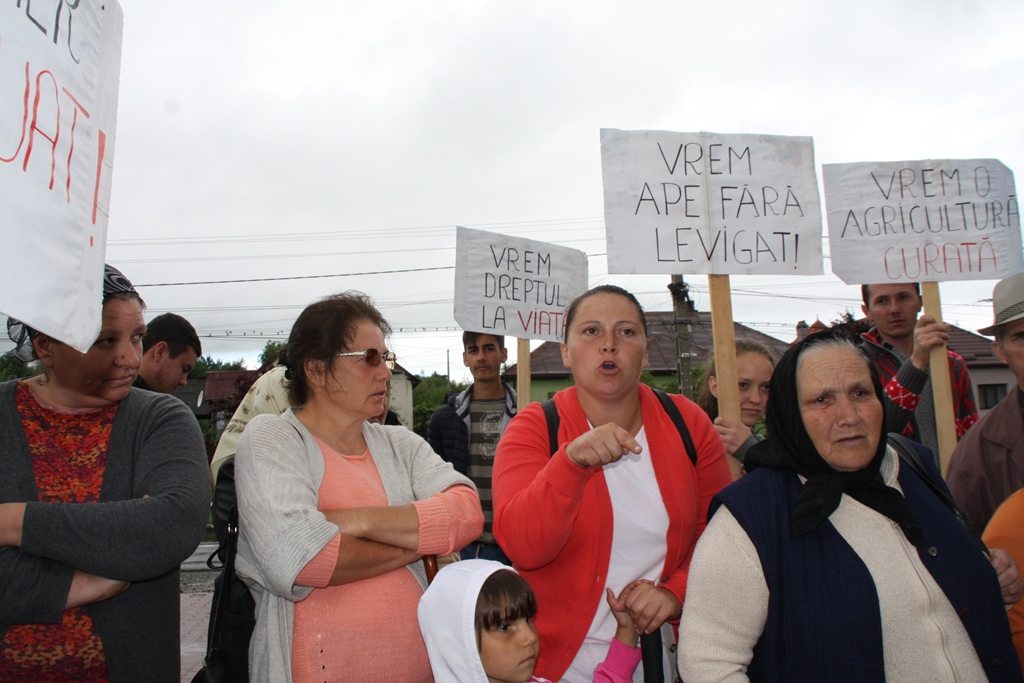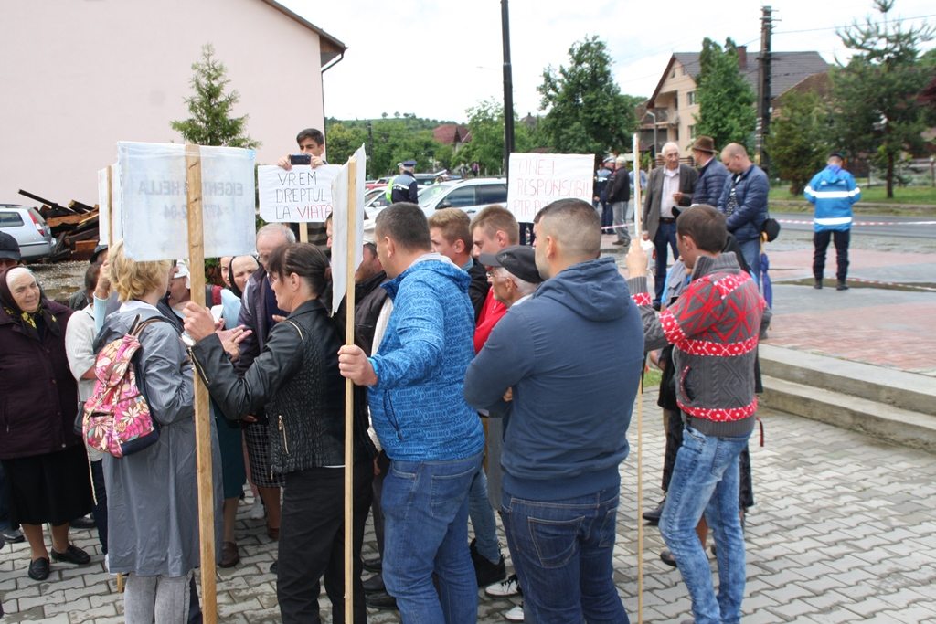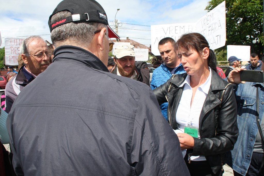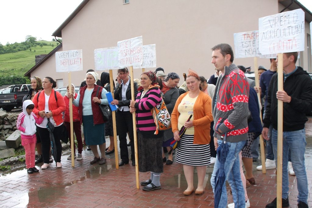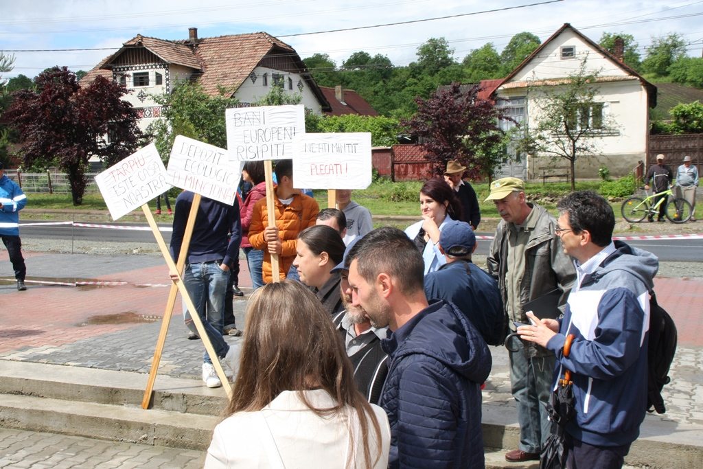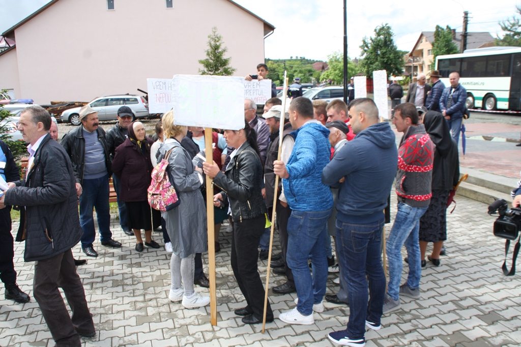 În jur de 100 de persoane, înarmate cu pancarte, au participat la protestul spontan, care a avut loc chiar în fața Primăriei Dumitra. Autoritățile locale au autorizat protestul și chiar au delimitat o zonă în fața primăriei unde oamenii au putut să-mi spună nemulțumirile.