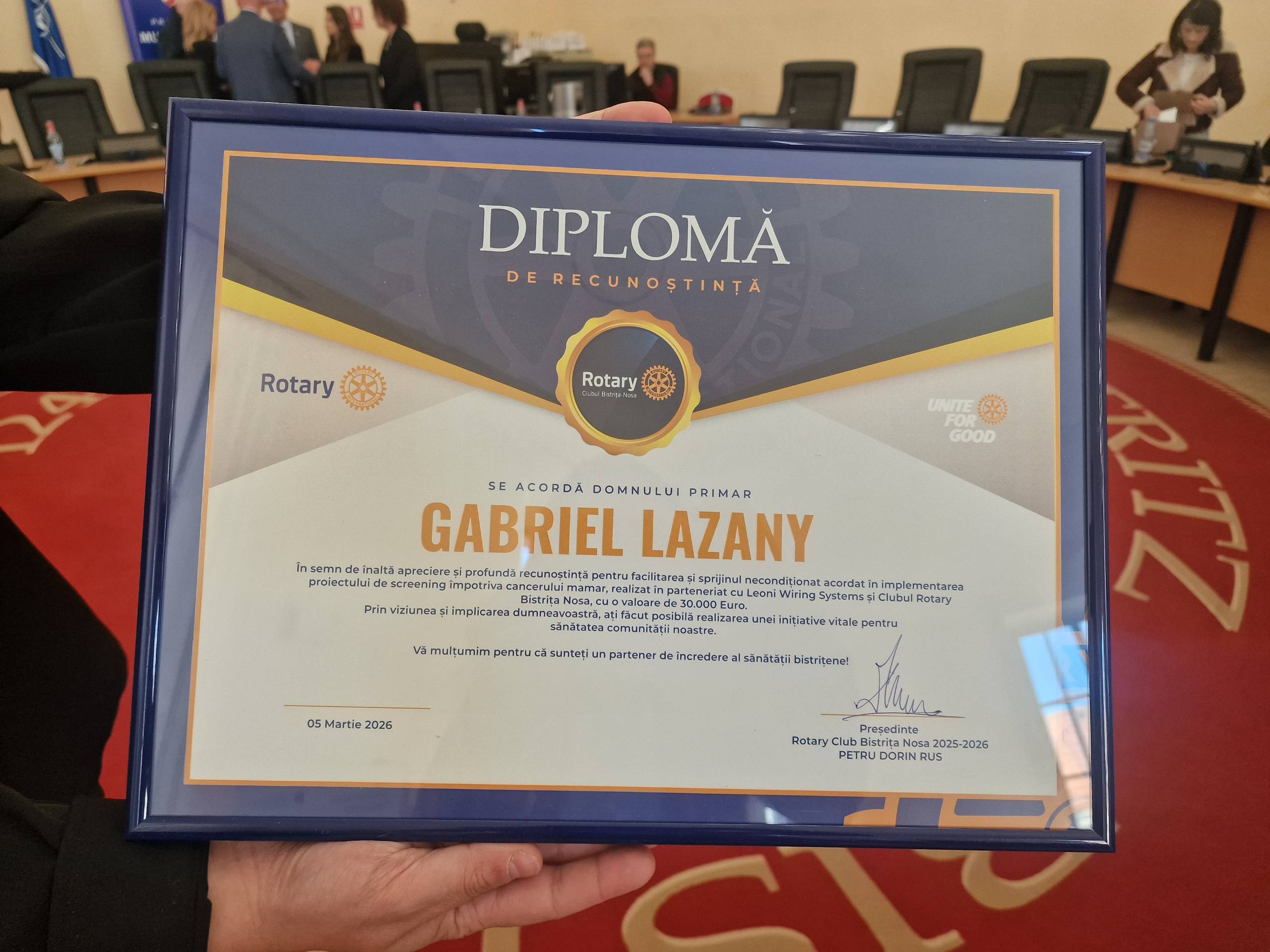 Acesta a oferit, în numele clșubului, câte o diplomă de recunoștință primarului Gabriel Lazany, spitalului și firmei Leoni.