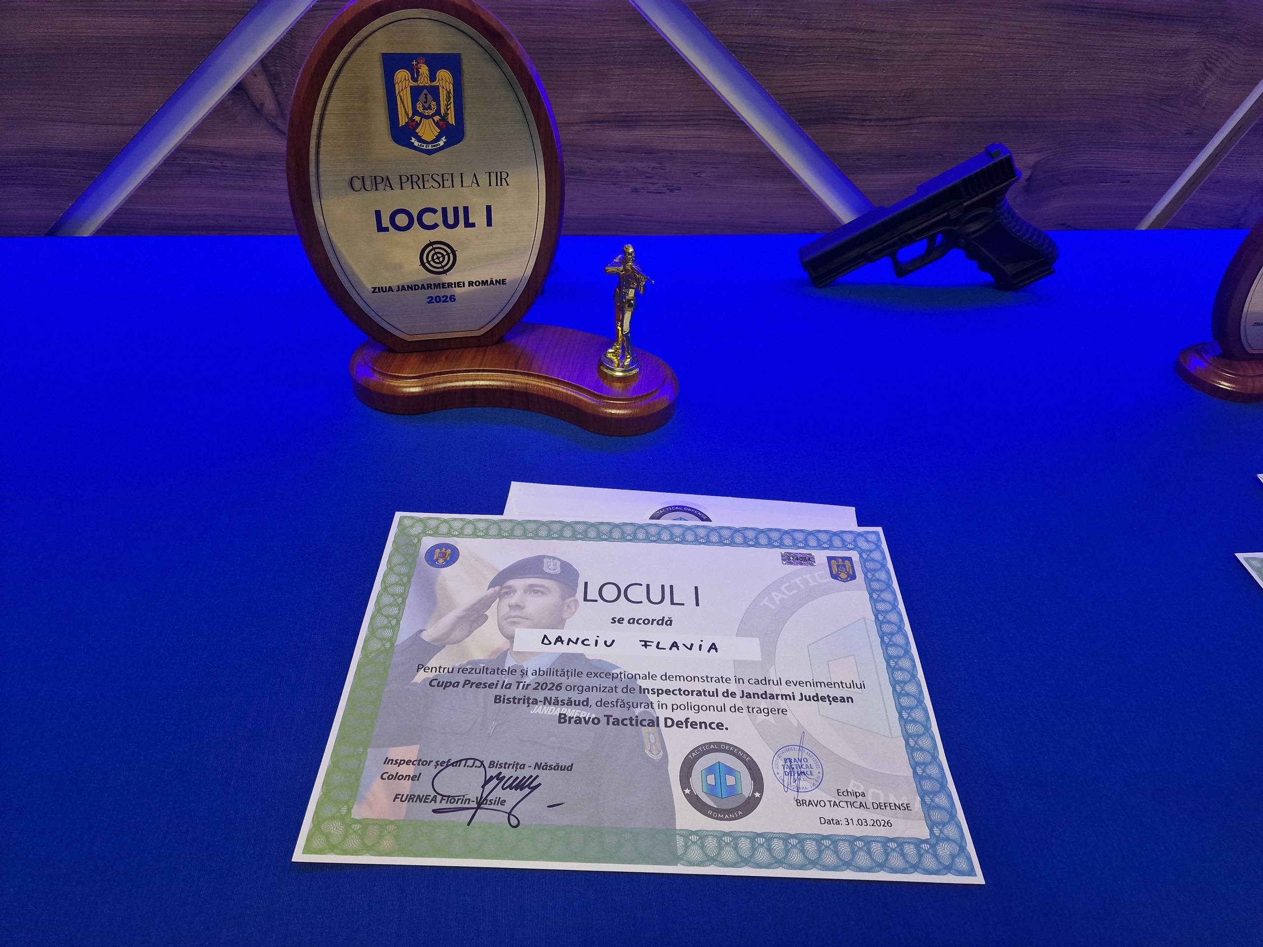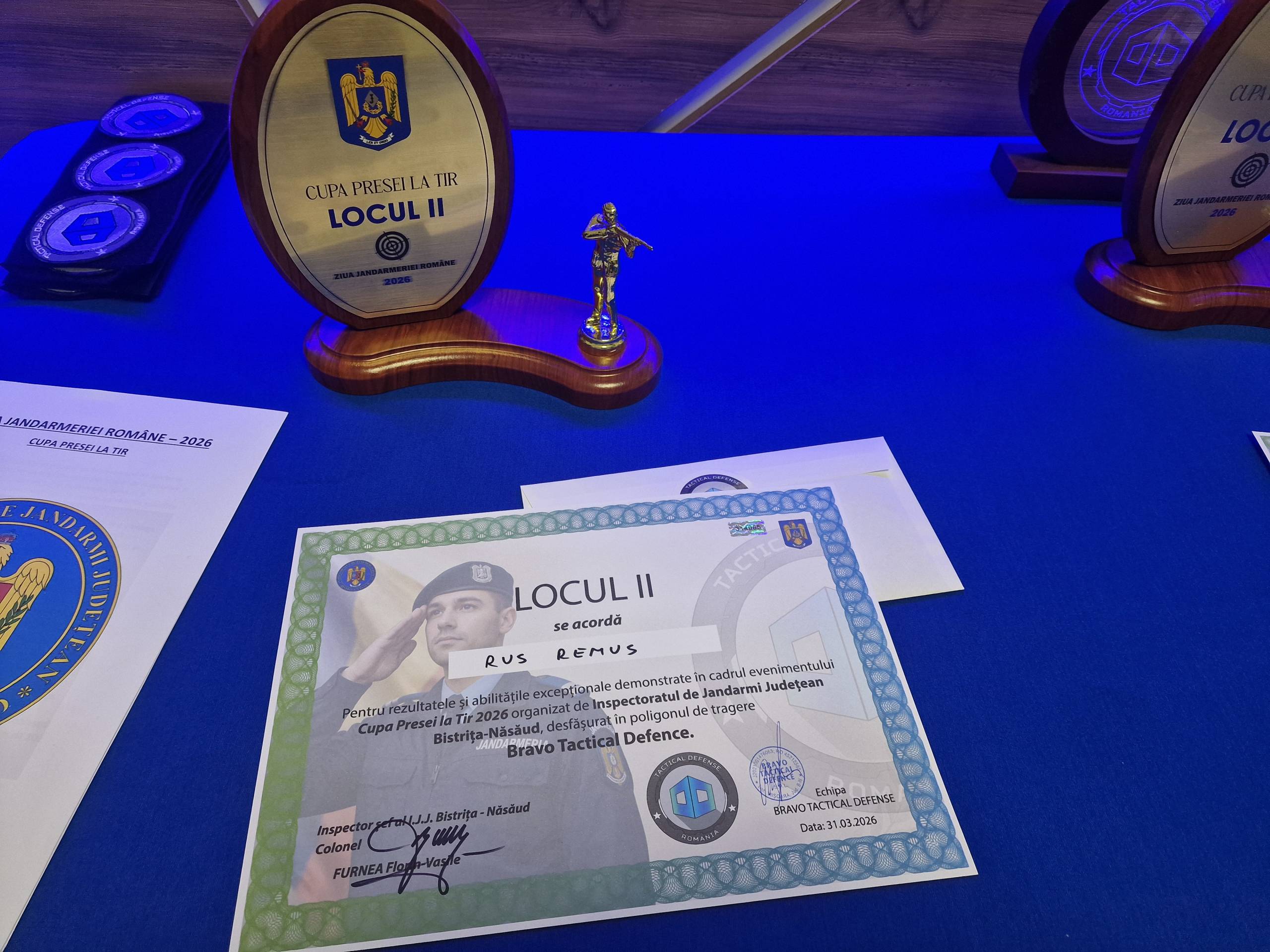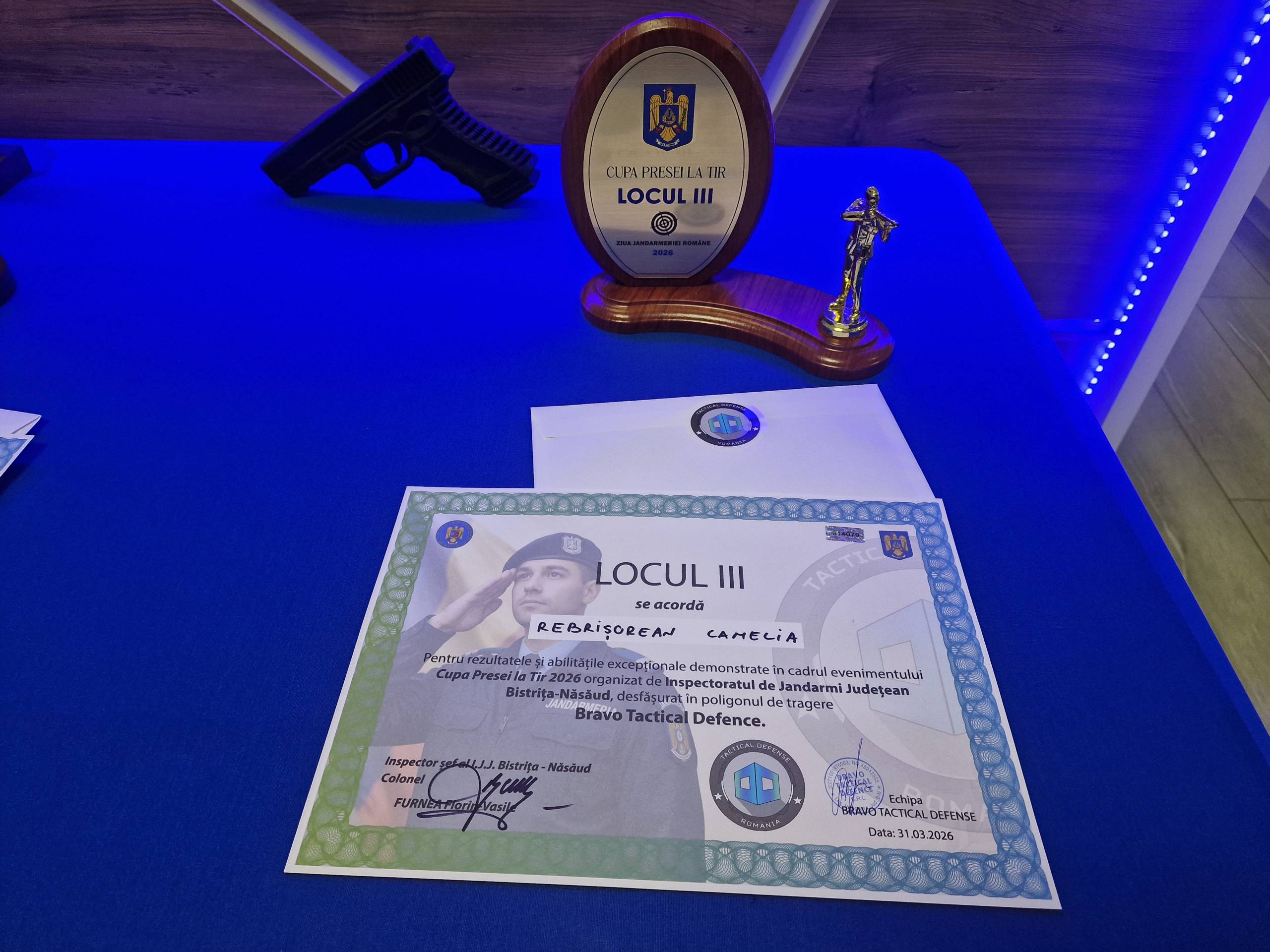 Cei trei au primit câte un trofeu și o diplomă – din partea IJJ BN – și câte un voucher din partea Poligon Bistrița Tactical Defense.