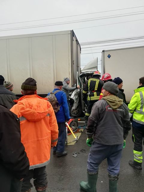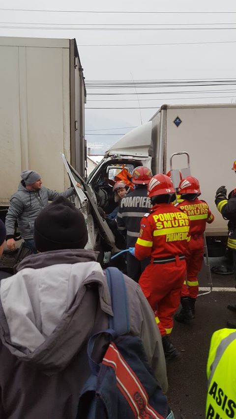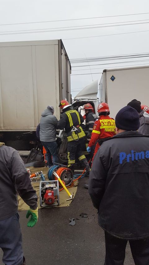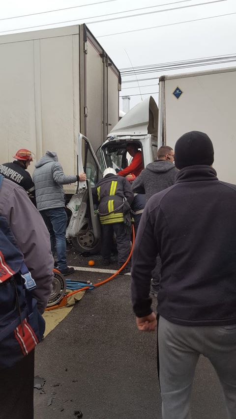 S-ar părea că un TIR a frânat pentru a opri la o trecere de pietoni. Șoferul unei camionete nu a mai putut opri la timp, intrând în TIR. Șoferul camionetei a rămas încarcerat.