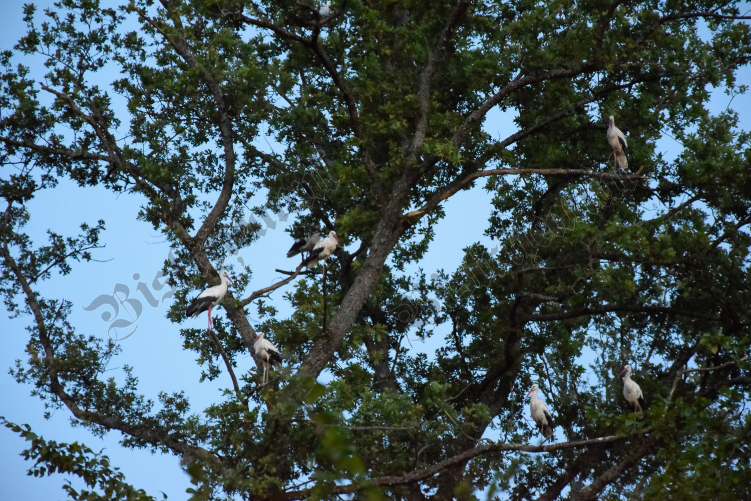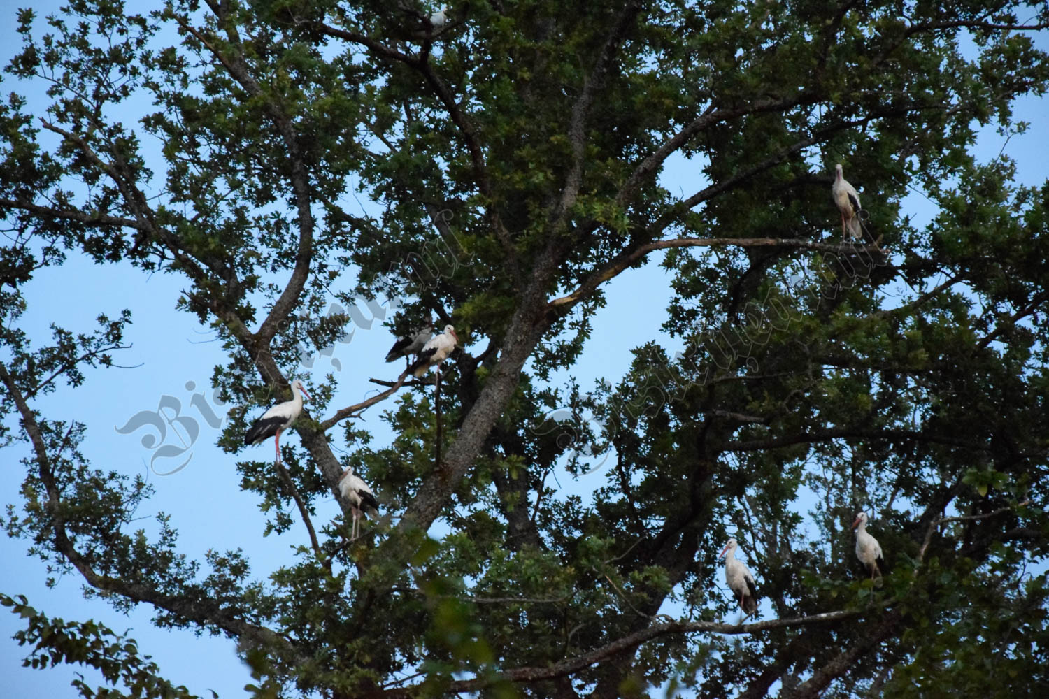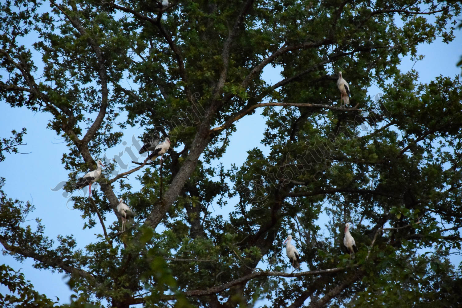 După ce se înserează, încep să apară, în zbor, berze. Câte una, sau grupuri de 7 – 10 odată, toate îndreptându-se spre un copac, din care clămpăne prima barză ce ajunge în zonă.