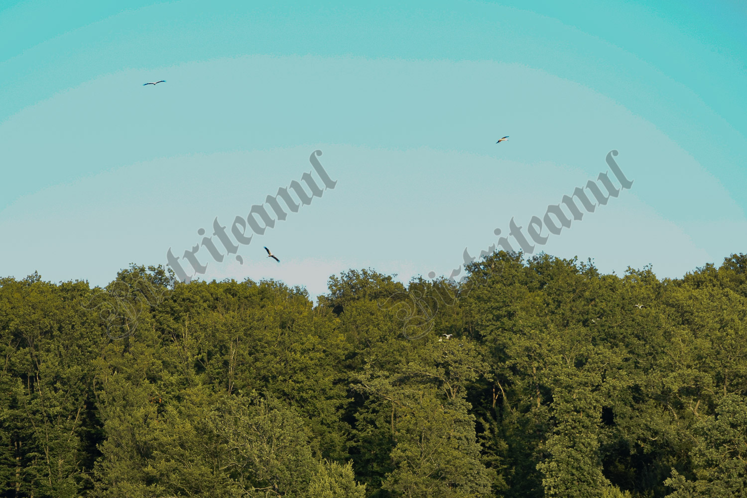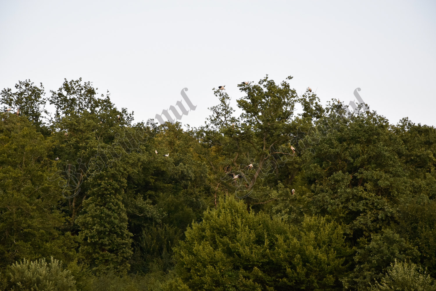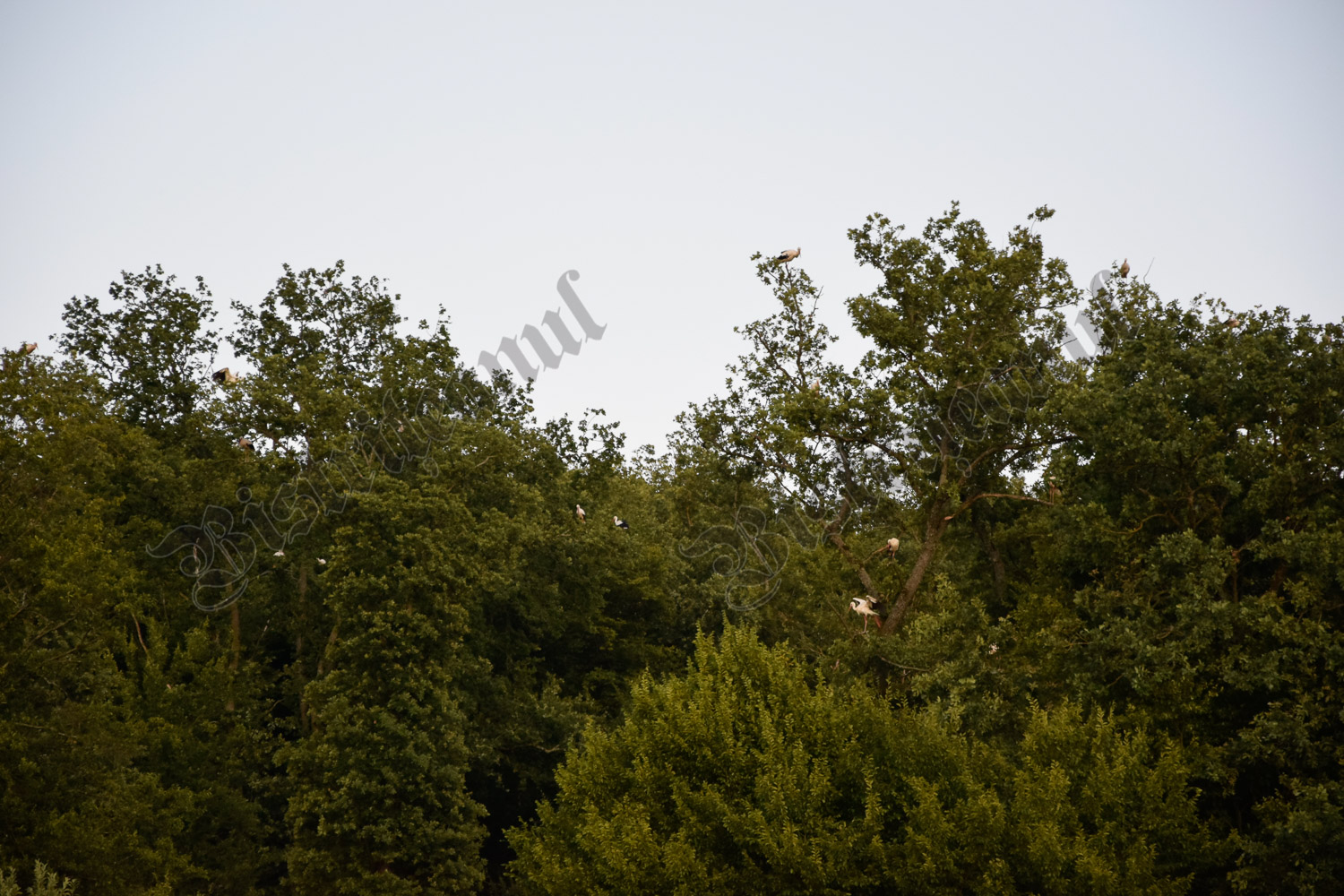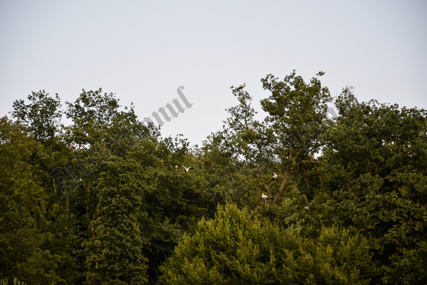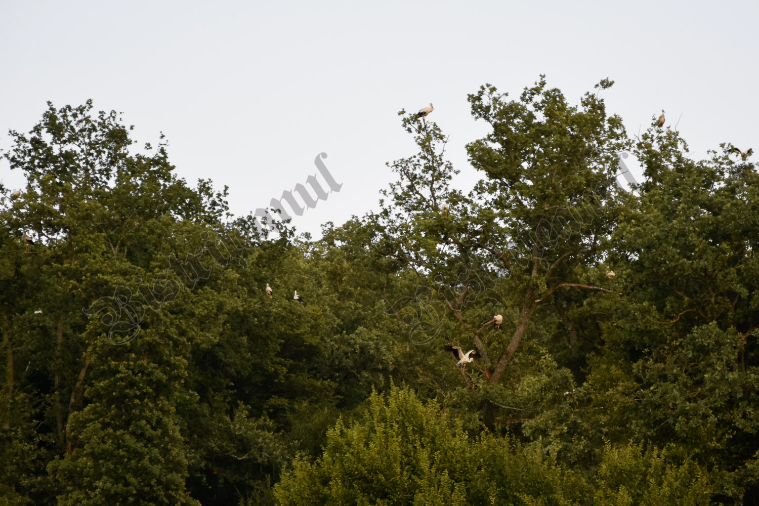 La fel și aici, la marginea pădurii, din grupul mare se desprinde, periodic, câte un grup de două sau patru berze, care merg pe un alt copac, la o mică distanță de cel mare.