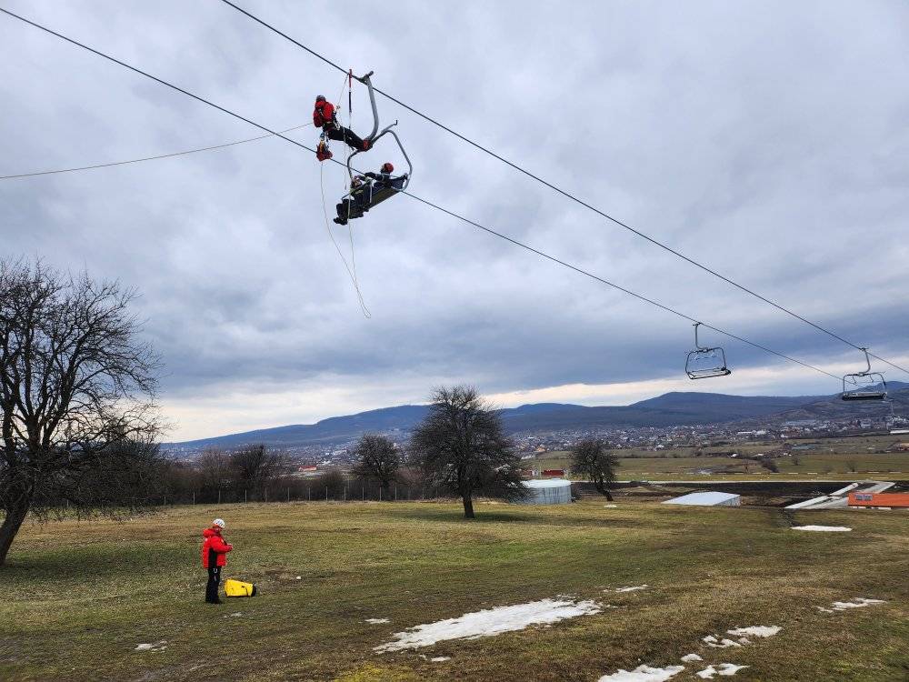 Salvamontiștii din Bistrița-Năsăud fac pregătiri pentru o situație care ar putea apărea pe Pârtia Cocoș: blocarea unei persoane sau mai multor persoane pe telescaun.