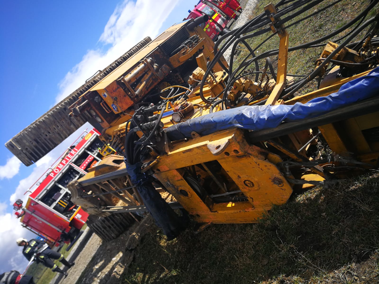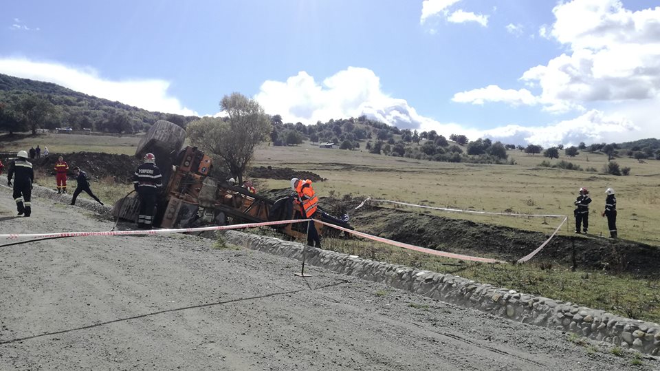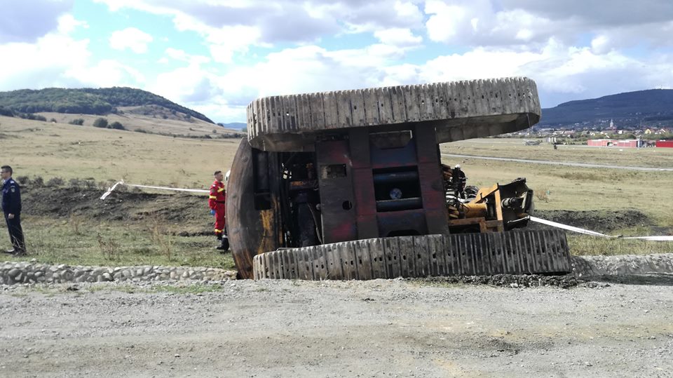 Doar că, la un moment dat, în timp ce cobora de pe o platformă, s-a făcut balans, și utilajul, de 40 de tone s-a răsturnat. În cabină a rămas prins bărbatul, de 38 de ani, tatăl celor doi micuți. Acesta a decedat pe loc.