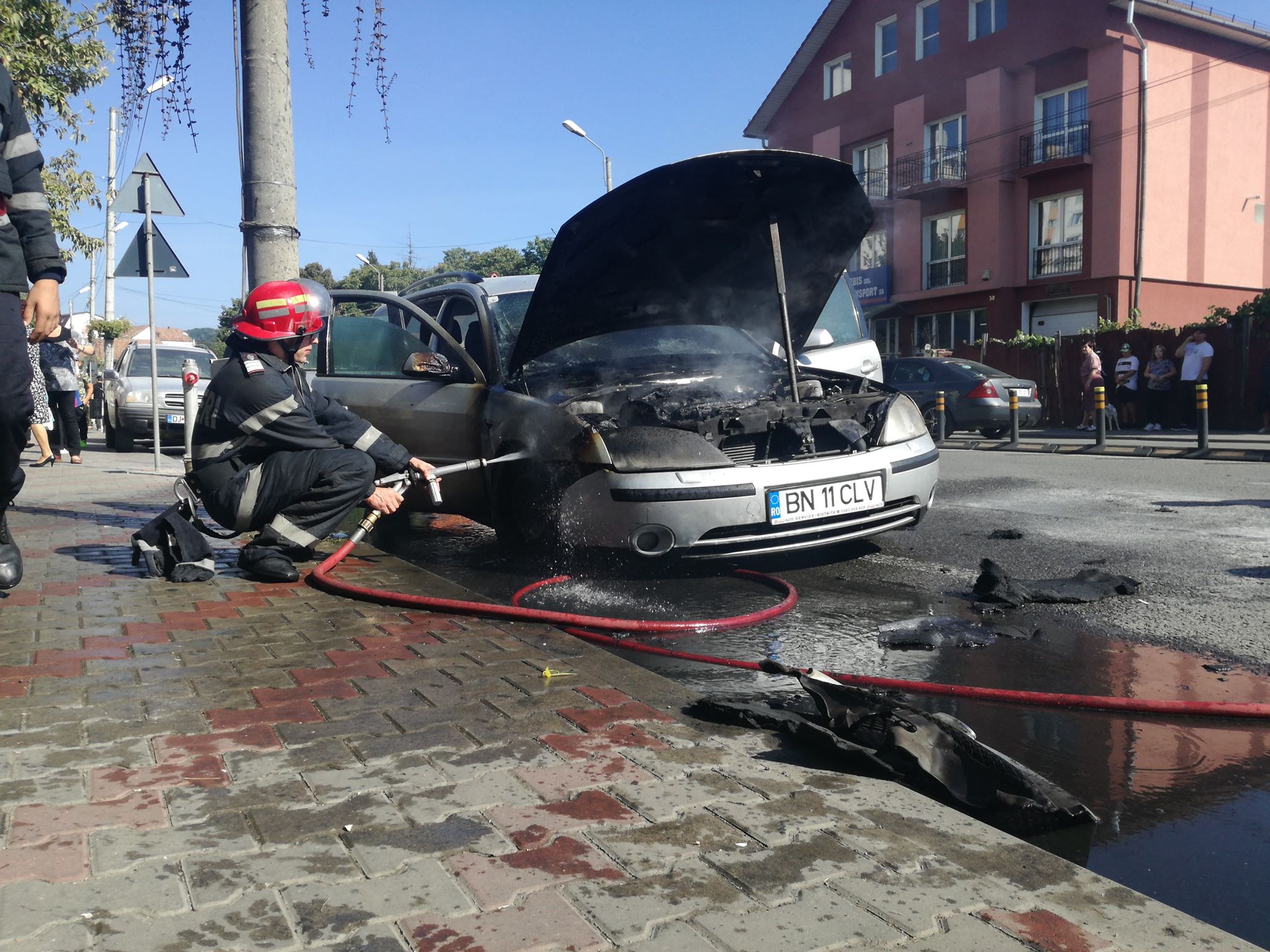 Șoferul, un bistrițean aproape de 60 de ani, a explicat că a simțit miros de fum. Iar șoferul care se afla în spatele lui a văzut flăcările, sub mașină. Deși a oprit imediat și a încercat să stingă focul cu un extinctor mai mic, și apoi cu unul mare, nu a făcut față flăcărilor. Așa că bărbatul și-a luat doar actele din mașină, pentru a le salva.