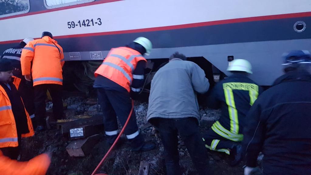 „Au deraiat osiile 5 și 6. Din ultimele informații, se acționează pentru repunerea trenului pe calea ferată”, informează Comitetul Județean pentru Situații de Urgență Bistrița-Năsăud.