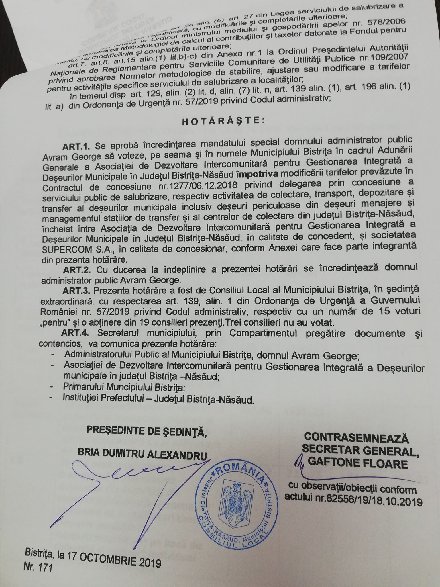 Pentru a-l mandata să voteze în numele bistrițenilor, consilierii locali s-au întrunit în ședință extreordinară în data de 17 octombrie 2019. Pe ordinea de zi, patru puncte. Dintr-o eroare, doar pentru trei dintre ele s-a pus în discuție „mandatarea lui George Avram”. Iar consilierii au hotărât ca acesta să voteze ÎMPOTRIVĂ: