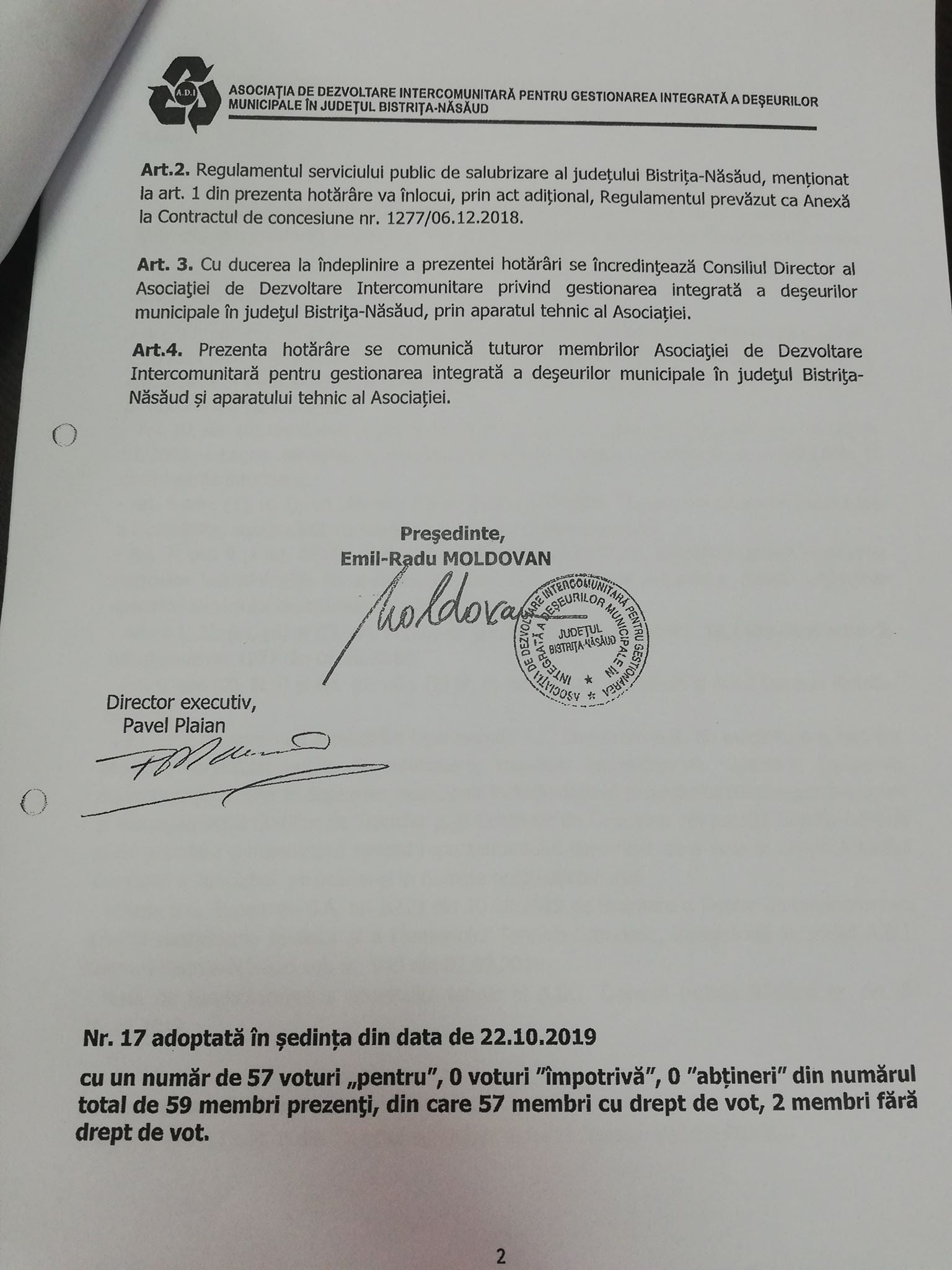 În data de 22 octombrie 2019 a avut loc ședința ADI Deșeuri, în care au fost supuse la vot 4 puncte. La această ședință au fost 59 de reprezentanți ai UAT-urilor. Municipiul Bistrița a fost reprezentat în comisie de George Avram.