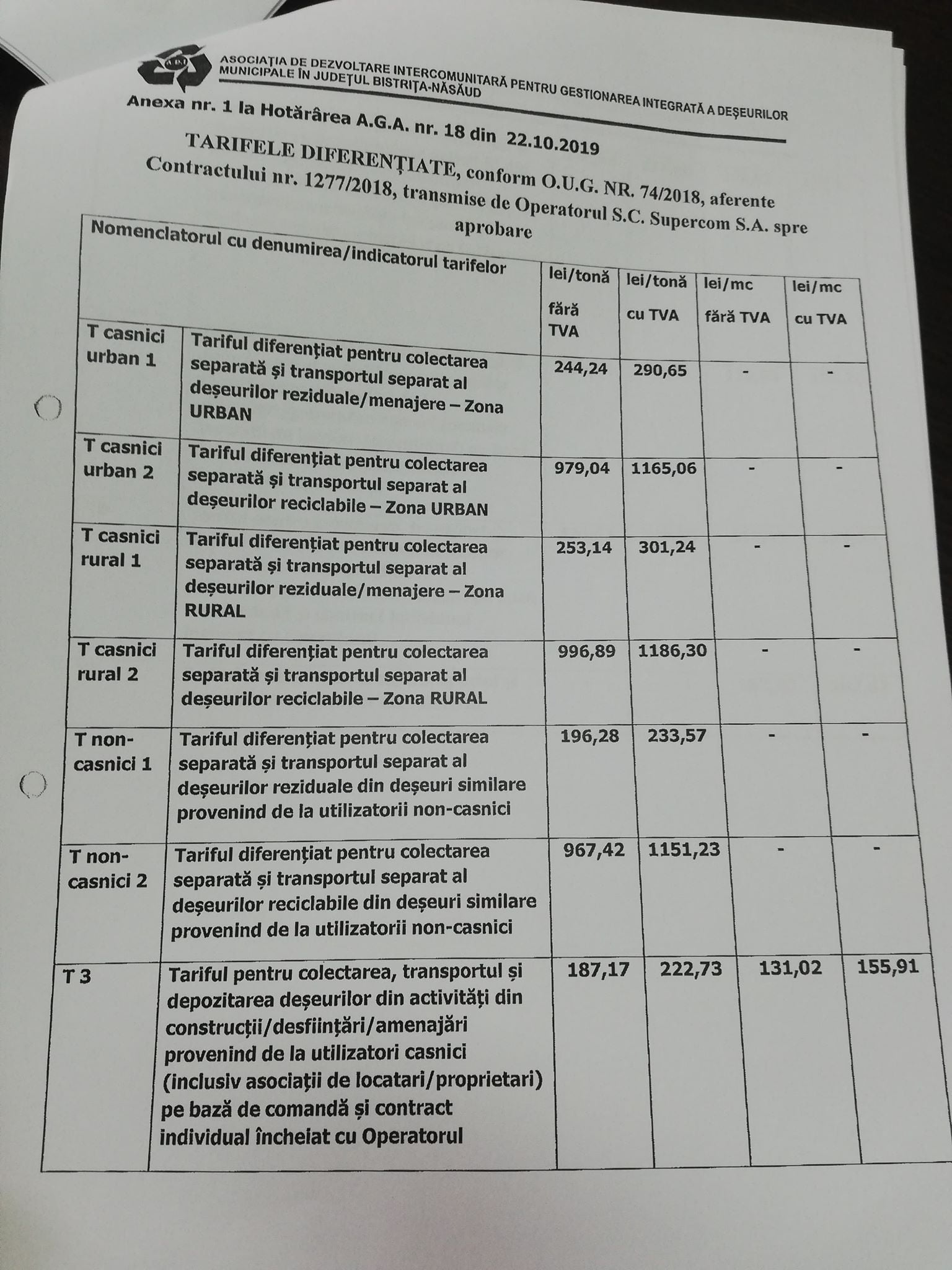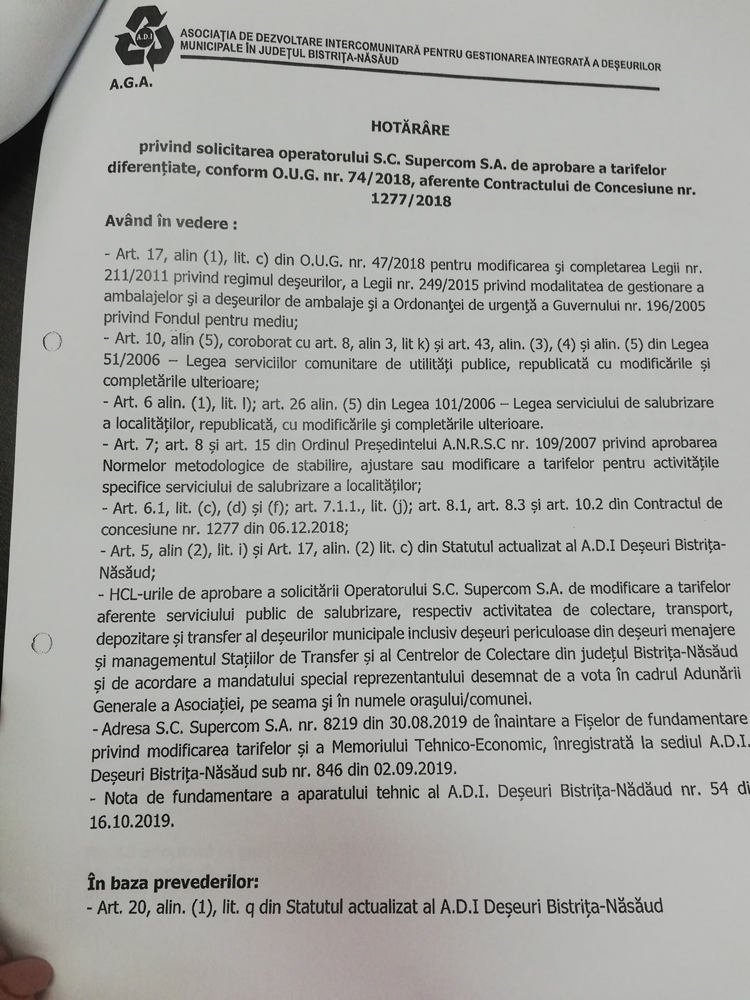 • modificarea tarifelor prevăzute în Contractul de concesiune nr. 1277/2018 privind delegarea prin concesiune a serviciului public de salubrizare, respectiv activitatea de colectare, transport, depozitare și transfer al deșeurilor municipale inclusiv deșeuri periculoase din deșeuri menajere și managementul stațiilor de transfer și al centrelor de colectare din județul Bistrița-Năsăud