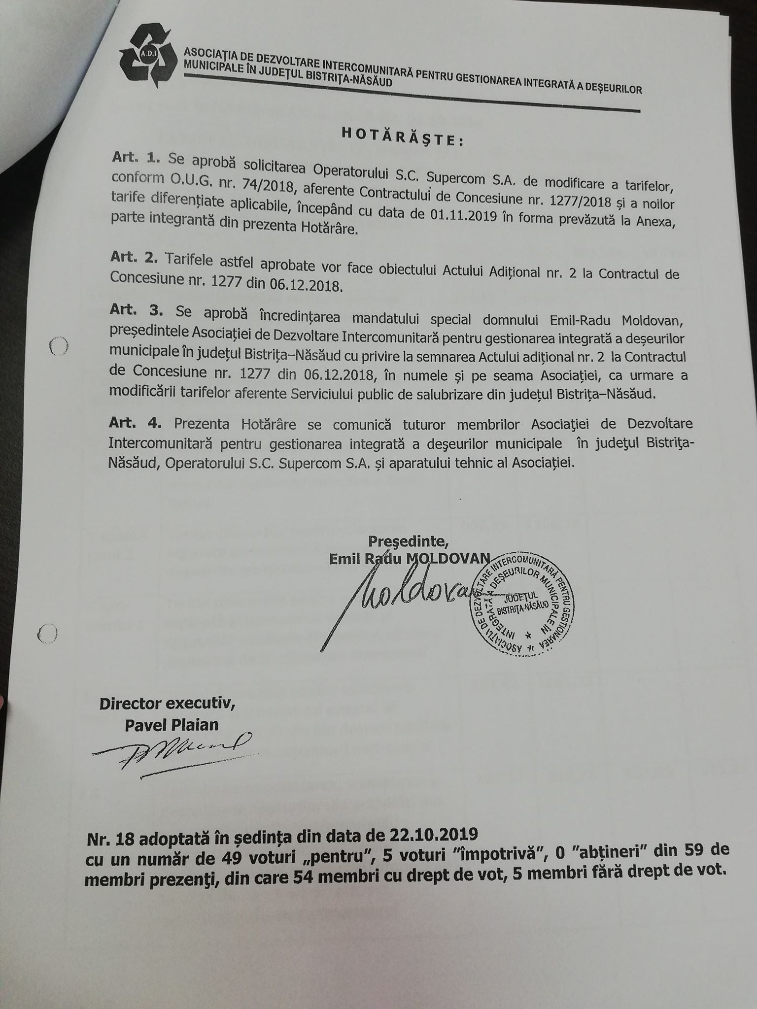 • modificarea, prin act adițional, a Contractului de concesiune nr. 1277 / 2018 privind delegarea prin concesiune a serviciului public de salubrizare, respectiv activitatea de colectare, transport, depozitare și transfer al deșeurilor municipale inclusiv deșeuri periculoase din deșeuri menajere și managementul stațiilor de transfer și al centrelor de colectare din județul Bistrița-Năsăud