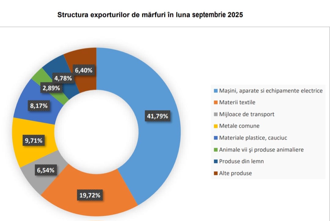 „Agenţii economici cu sediul în judeţ au realizat în luna septembrie 2025 exporturi în valoare de 57778 mii euro, o scădere cu 4,7% față de nivelul lunii corespunzătoare a anului anterior și o creștere cu 34,4% față de nivelul lunii precedente”, explică cei de la Direcția Regională de Statistică Bistrița-Năsăud.