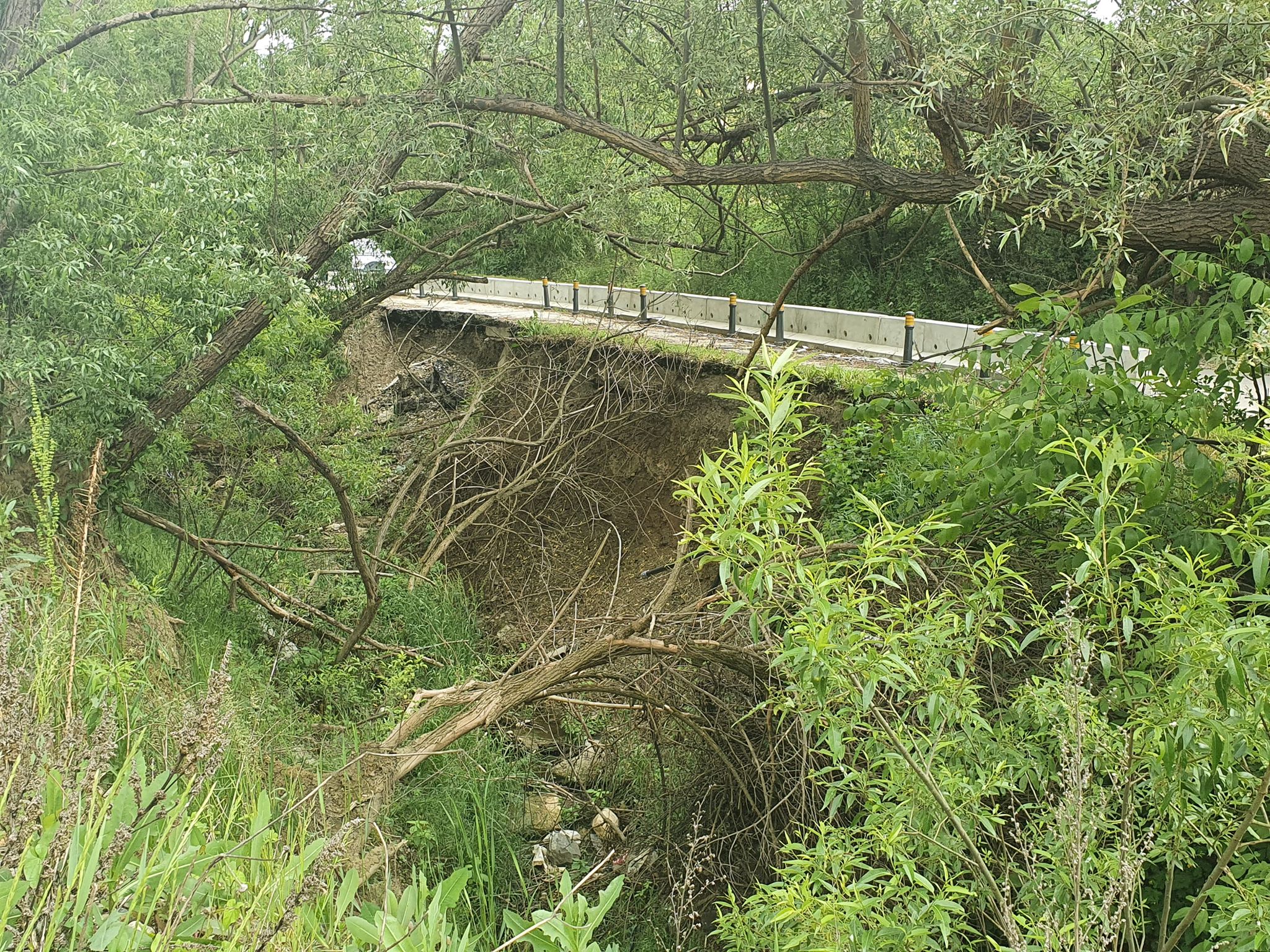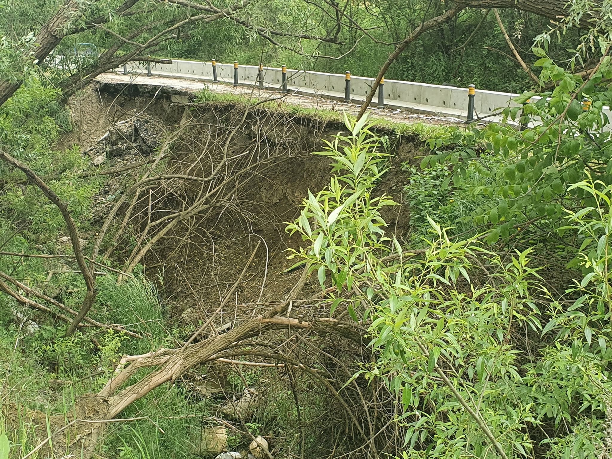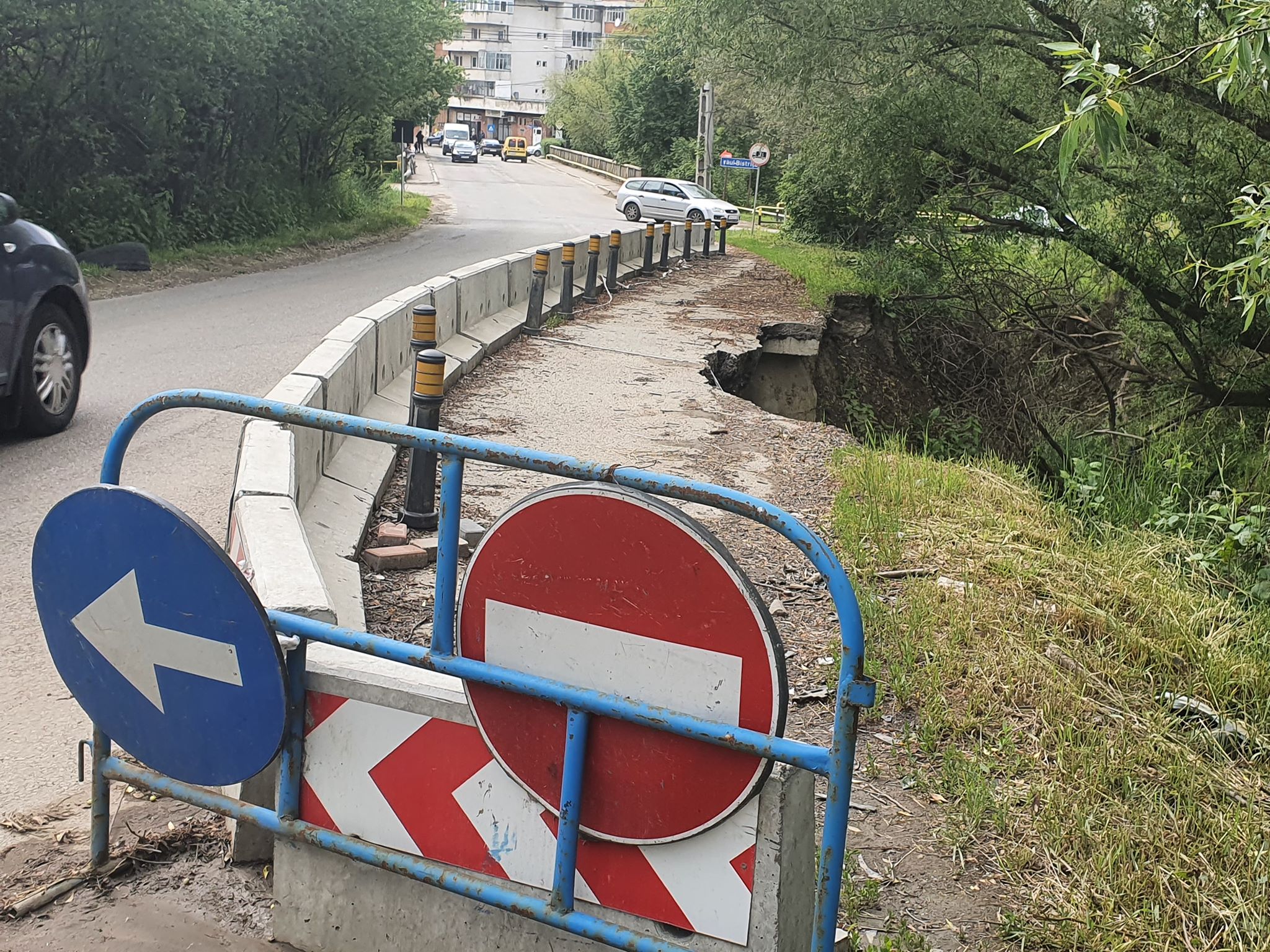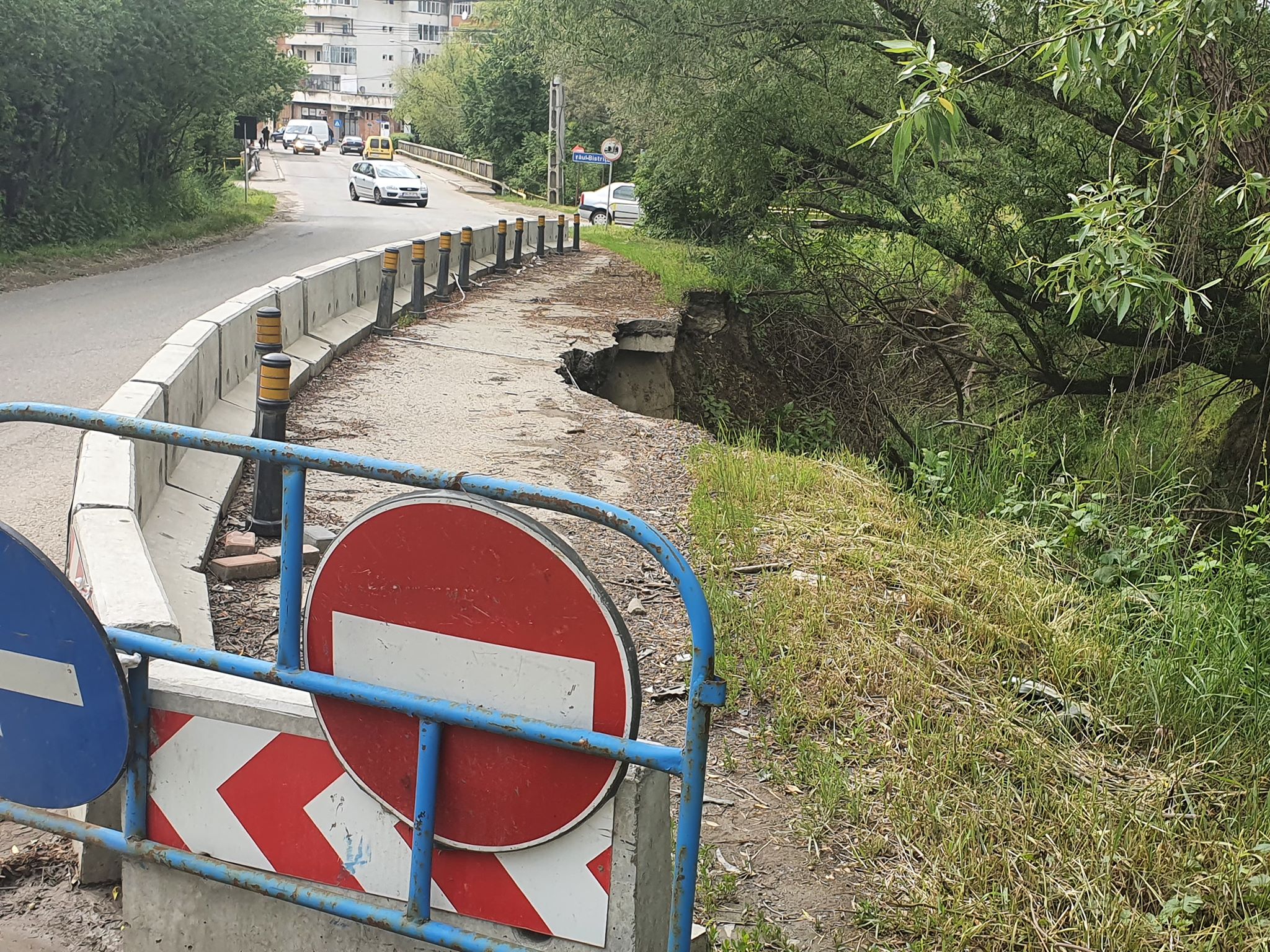 Imediat după pod și intersecția cu strada Ghinzii, o bucată de carosabil a fost efectiv ruptă sub greutatea apei de ploaie căzute.