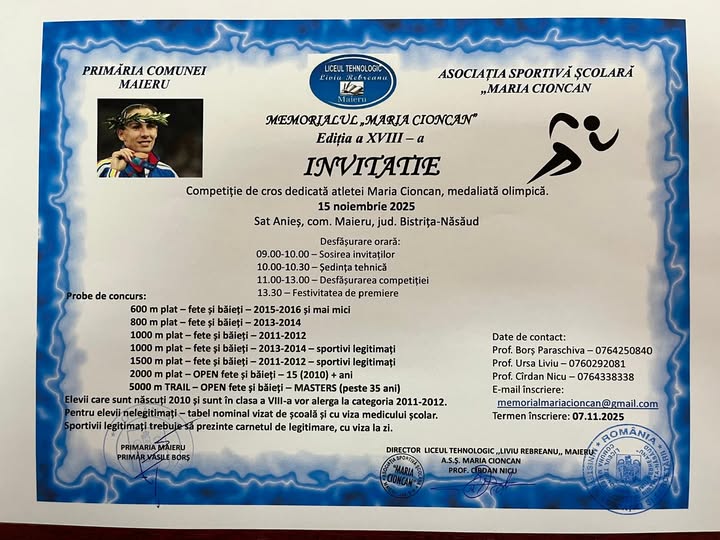 „Liceul Tehnologic „Liviu Rebreanu” Maieru și Asociația Sportivă Școlară „Maria Cioncan” Maieru au plăcerea de a vă invita sâmbătă, 15 noiembrie 2025, la Ediția a XVIII-a a Competiției de cros Memorialul „Maria Cioncan”, competiție atletică dedicată cinstirii memoriei marii noastre sportive, una dintre cele mai valoroase atlete ale României.