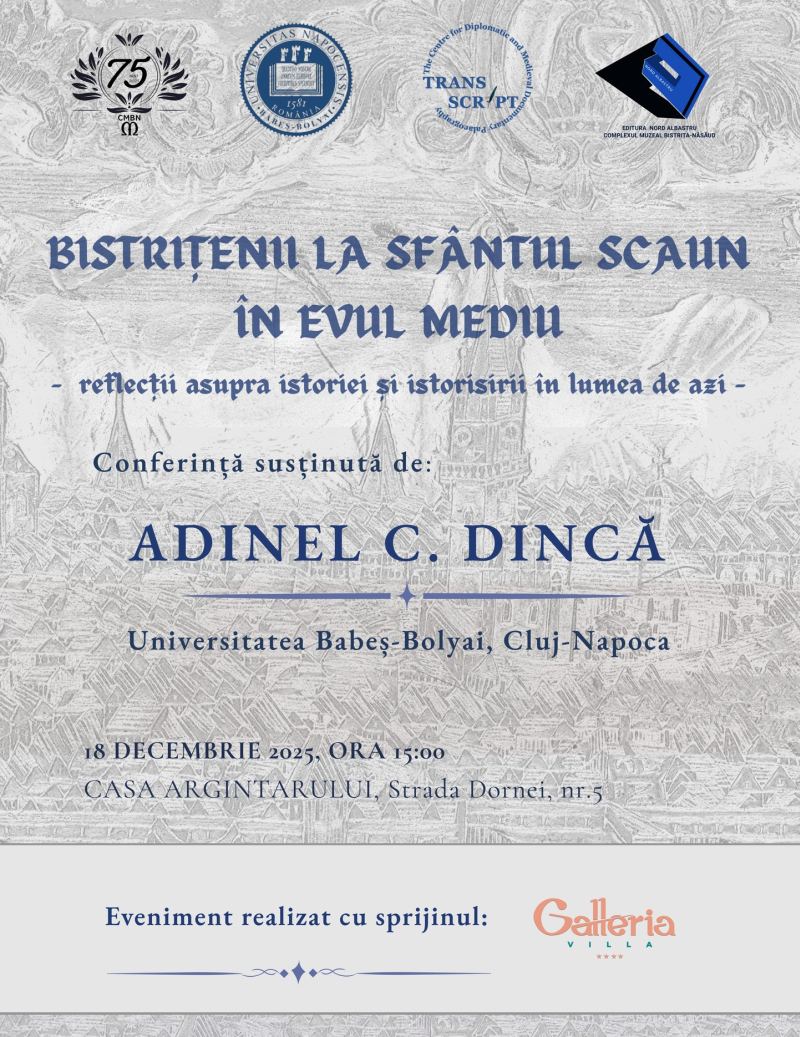 Un subiect esențial pentru istoria orașului – legăturile dintre comunitatea bistrițeană și Sfântul Scaun în epoca medievală – va fi dezbătut într-o conferință-eveniment, la Casa Argintarului. Invitat: istoricul Adinel C. Dincă, conf. univ. al Facultății de Istorie și Filosofie a Universității „Babeș -Bolyai” din Cluj.
