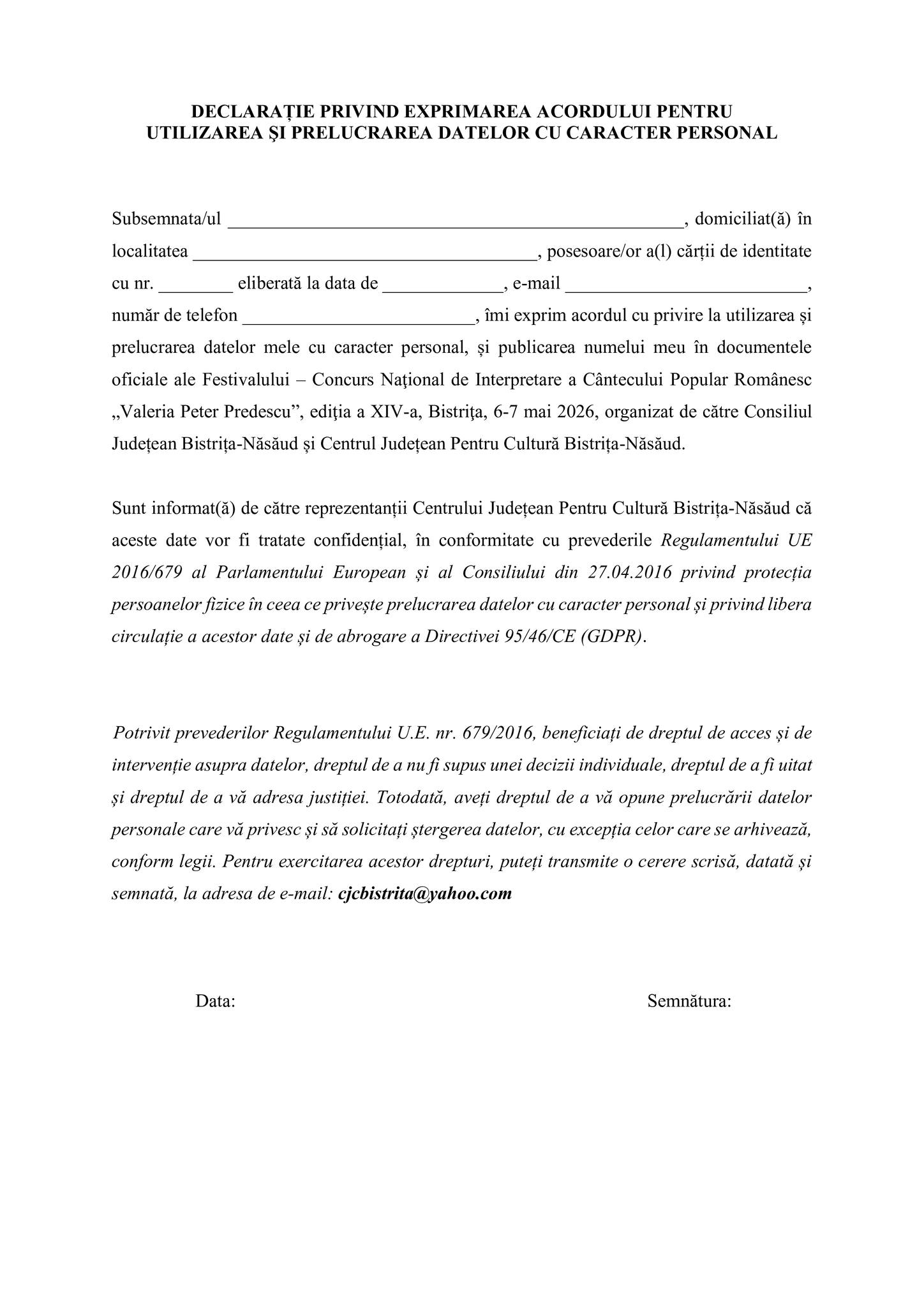 Fişele de înscriere în concurs vor fi trimise pe adresa Centrului Judeţean pentru Cultură Bistriţa-Năsăud, str. Gen. Grigore Bălan, nr. 11, Bistriţa – telefon /fax. 0263/212023, 0263/232571, pe e-mailul instituției: [email protected]. Data limită de trimitere a fișelor de înscriere este 20 aprilie 2026. Fișele trebuie să fie însoţite obligatoriu de înregistrarea audio-video a capella a cântecelor populare, împreună cu partiturile muzicale aferente pieselor ce vor fi interpretate cu acompaniament orchestral.