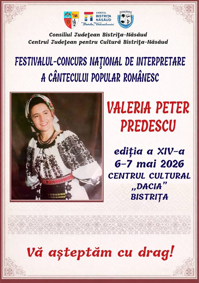 Interpreții de folclor care își doresc să participe la Festivalul Concurs Naţional de Interpretare „Valeria Peter Predescu” din Bistriţa se pot înscrie până în 20 aprilie. Concursul se adresează artiştilor amatori, solişti vocali din ţară / străinătate. Concurenții trebuie să aibă vârsta cuprinsă între 16 – 35 ani.