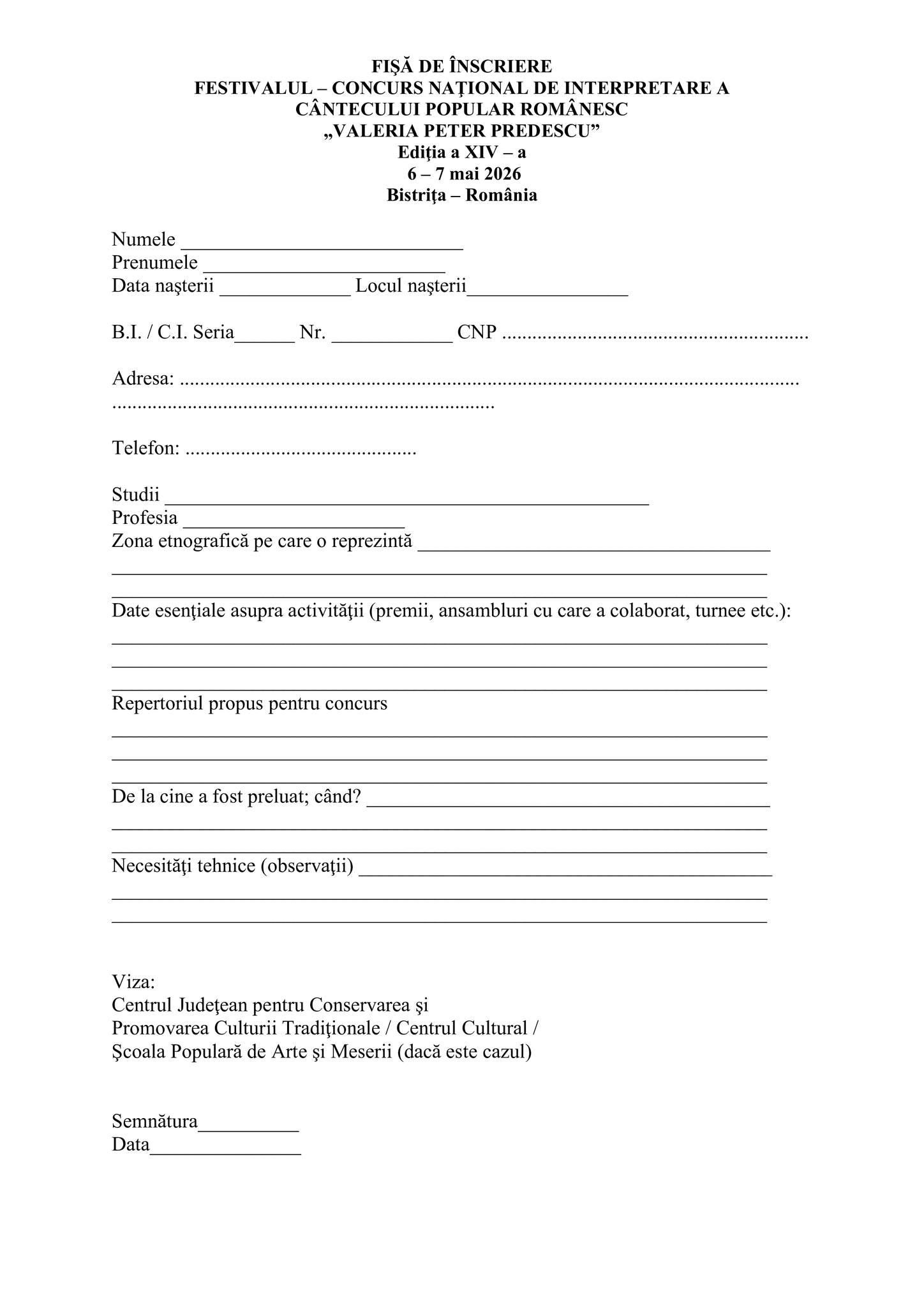 Fişele de înscriere în concurs vor fi trimise pe adresa Centrului Judeţean pentru Cultură Bistriţa-Năsăud, str. Gen. Grigore Bălan, nr. 11, Bistriţa – telefon /fax. 0263/212023, 0263/232571, pe e-mailul instituției: [email protected]. Data limită de trimitere a fișelor de înscriere este 20 aprilie 2026. Fișele trebuie să fie însoţite obligatoriu de înregistrarea audio-video a capella a cântecelor populare, împreună cu partiturile muzicale aferente pieselor ce vor fi interpretate cu acompaniament orchestral.
