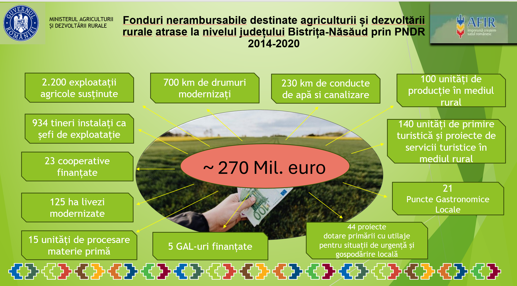 Sorin Roșu – Mareș, directorul Oficiului Județean pentru Finanțarea Investițiilor Rurale Bistrița-Năsăud a prezentat azi situația investițiilor prin PNDR. Programul 2014 – 2020 – cu prelungire 2021 și 2022 din cauza pandemiei- a atras investițiid e aproximatiov 270 de miliaone lei.
