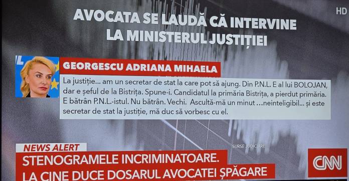 „La justiție… am un secretar de stat la care pot să ajung. Din PNL. E al lui Bolojan, dar e șeful de la Bistrița. Spune-i. Candidatul la Primăria Bistrița, a pierdut primăria. E bătrân PNL-istul. Nu bătrân, vechi. Ascultă-mă un minut … și este secretar de stat la Justiție, mă duc să vorbesc cu el”, spune Adriana Georgescu.