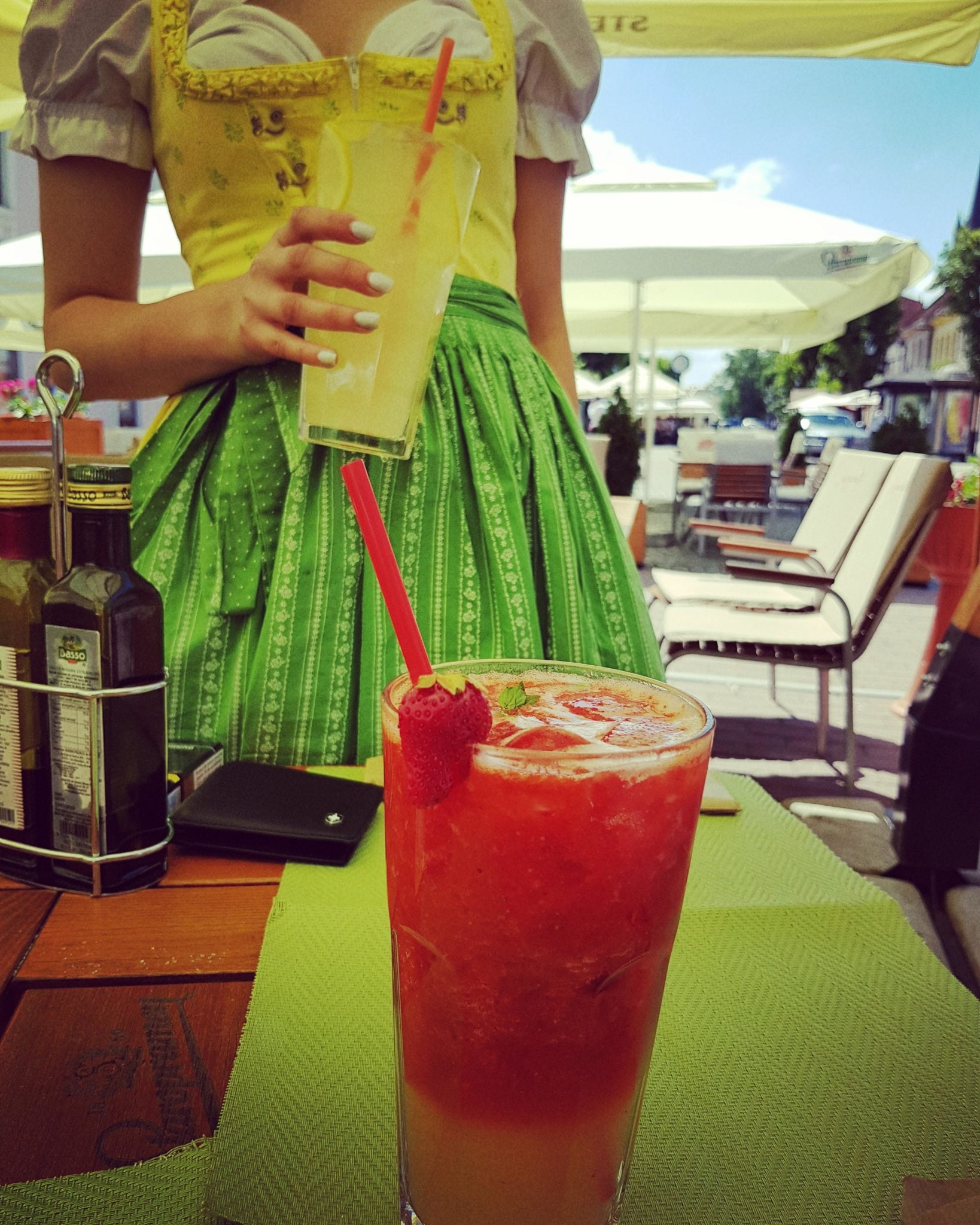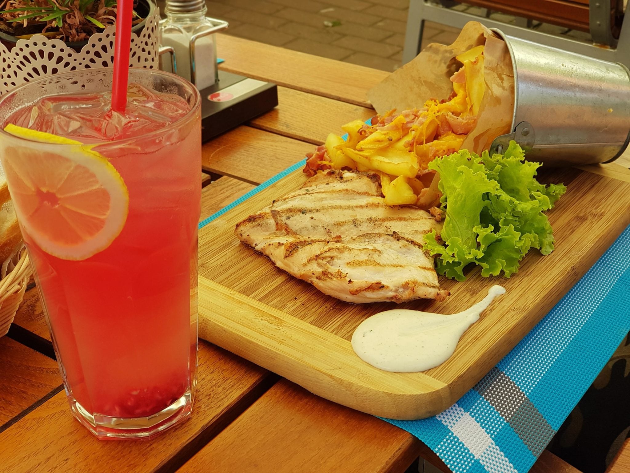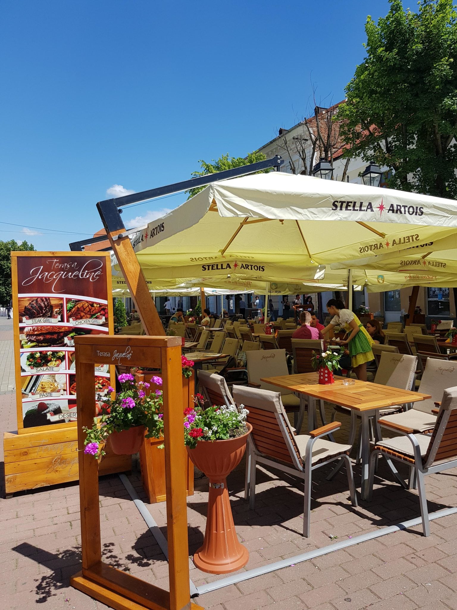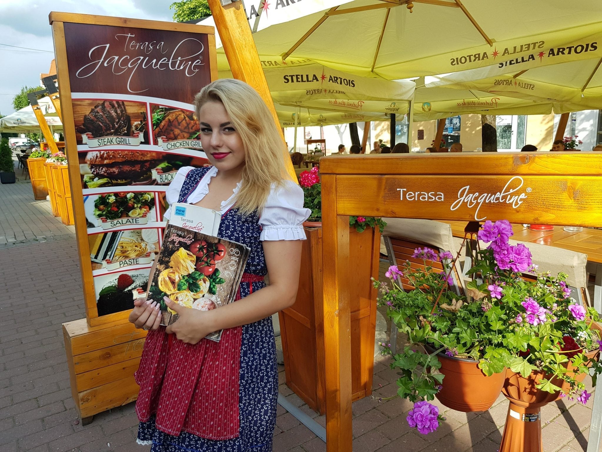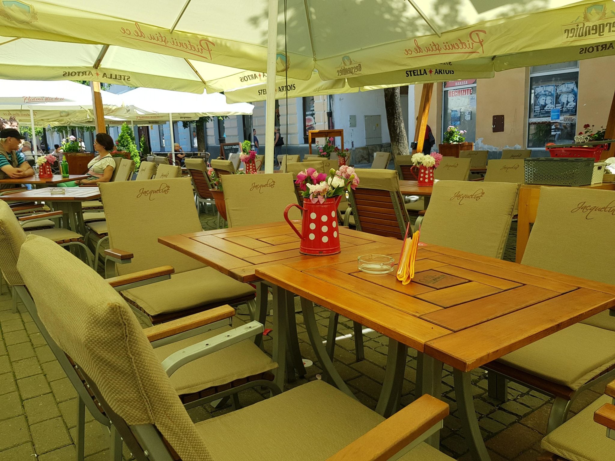 Dacă ajungi în Centrul Vechi al Bistriței nu ai cum să ratezi Terasa Jacqueline! Este una dintre cele mai frumoase și vesele, cu flori pe mese și fete îmbrăcate în rochii bavareze – faimoasele dirndl. Pe mese ai să vezi limonade colorate în pahare uriașe și dacă ai să arunci o privire către farfuriile clienților ai să vezi că bucătăria și modul de servire au ceva aparte, ce n-a prea văzut Bistrița.