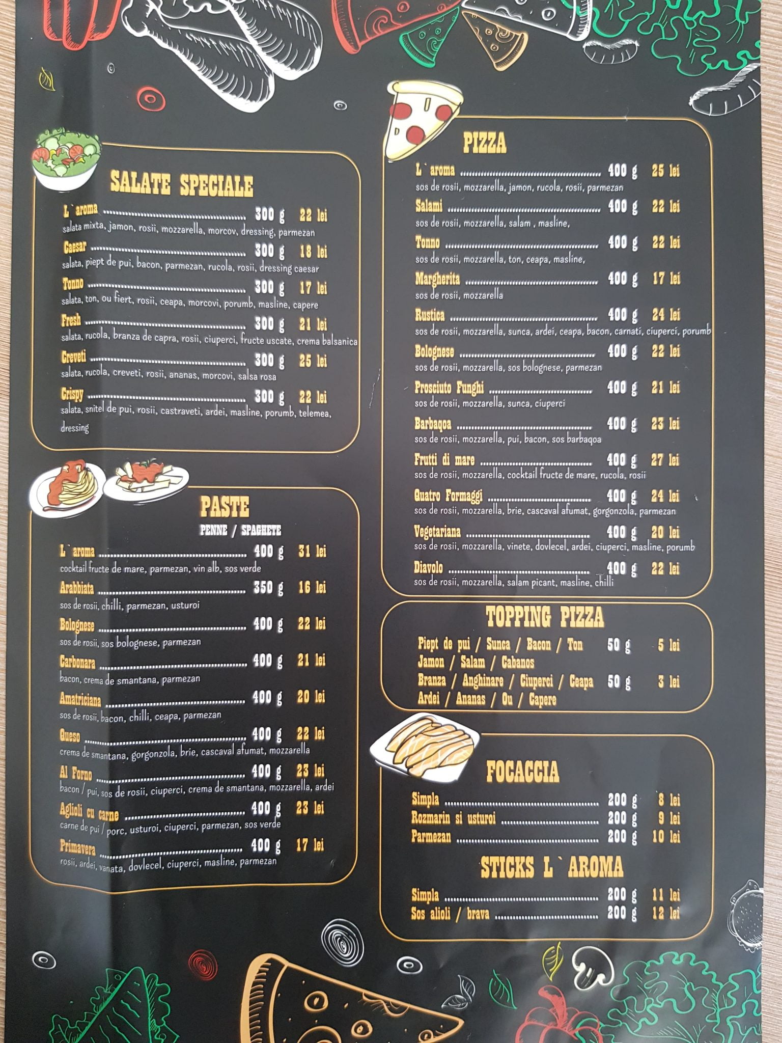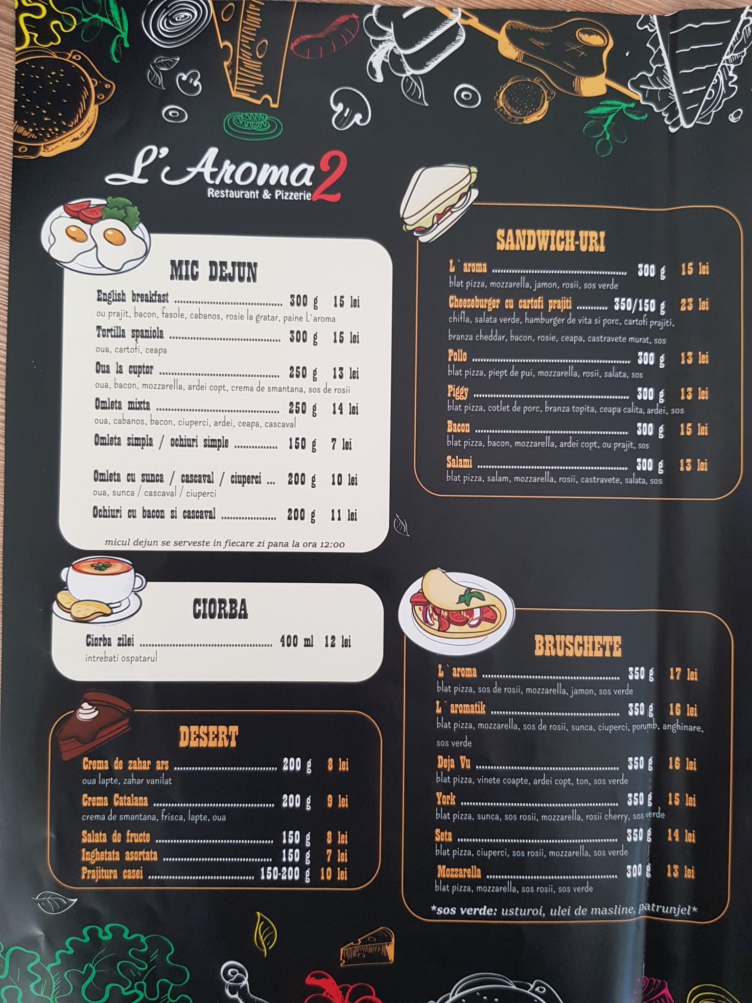 În galeria de mai jos puteți da un ochi peste meniul L’Aroma 2, iar dacă vreți să comandați ceva acasă sau la serviciu, ori să vă rezervați o masă, nu trebuie decât să sunați la telefonul 0747492508 și să spuneți ce doriți.
