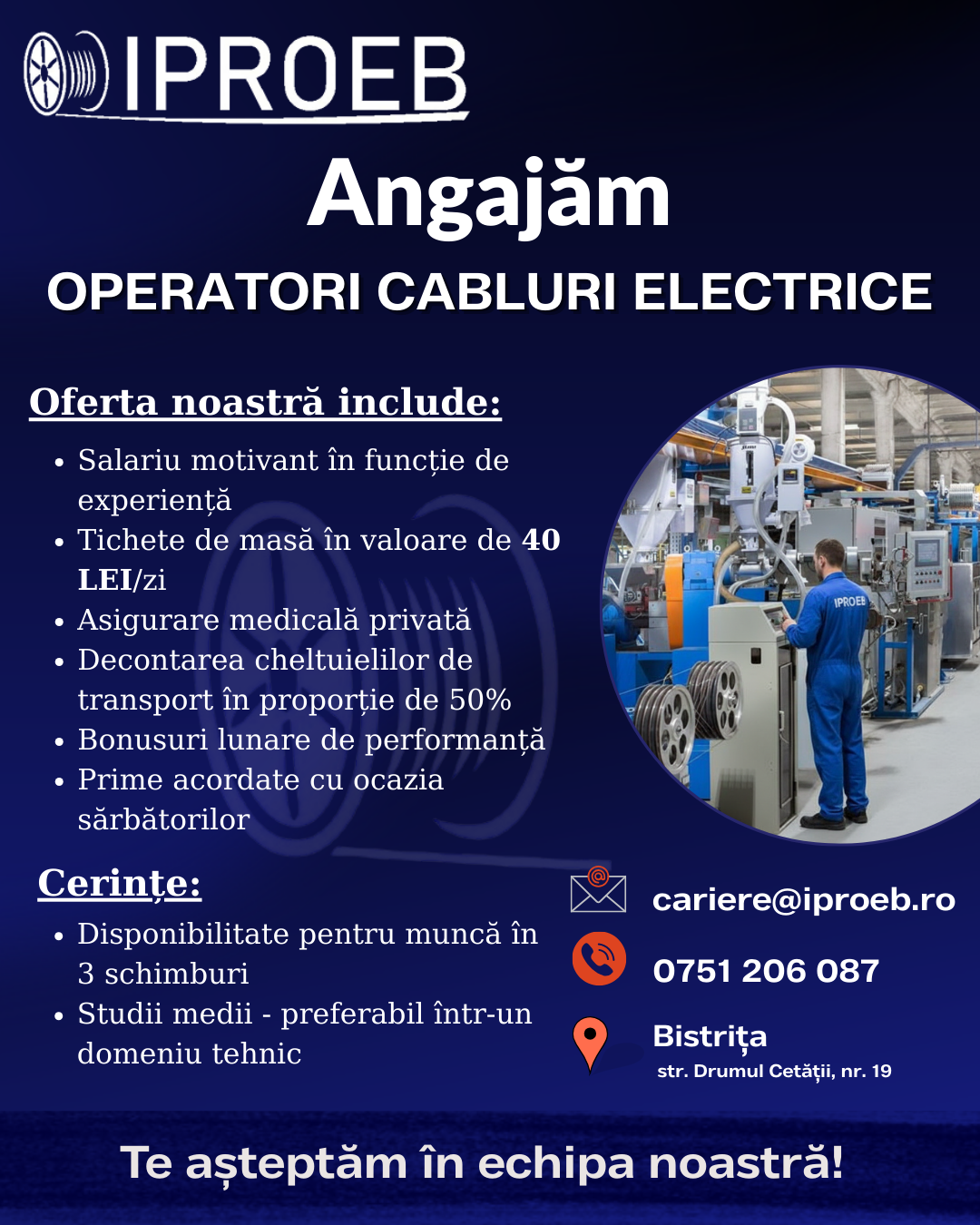 Compania RCB ELECTRO 97 Bistrița, producător de cabluri electrice, angajează pe perioadă nedeterminată: