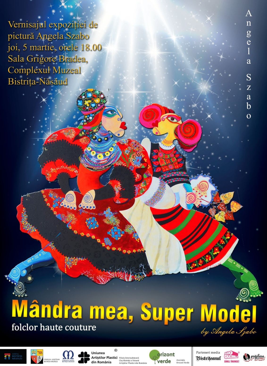 După expoziția de la Castelul Teleki (Posmuș), Angela Szabo poposește și la Bistrița cu picturile reunite sub titulatura Mândra mea. Super Model. Ni se propune o reinterpretare în notă personală a unor simboluri și motive universale, transpuse într-un univers artistic modern și contemporan.