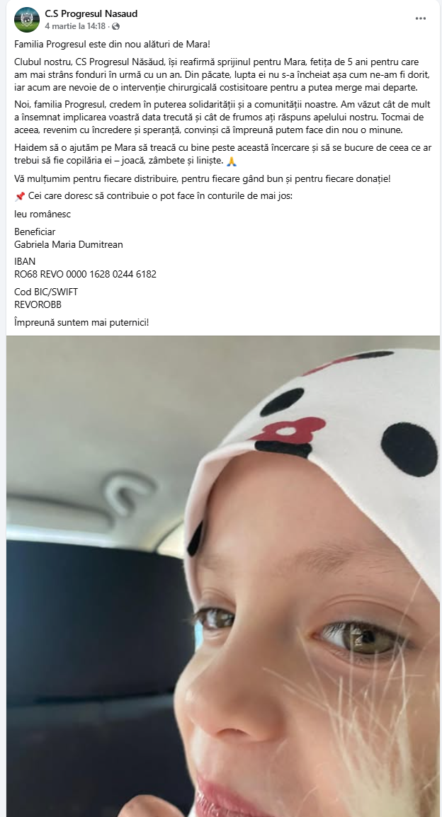 Mulțumesc tuturor celor care vor dona!” a transmis reporterilor ziarului local Bistrițeanul.ro, Gabriela Dumitrean, mama Marei.