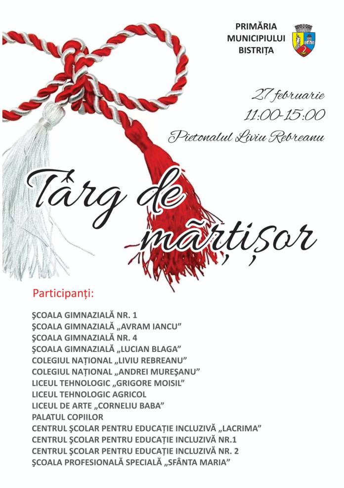Primăria municipiului Bistrița, prin Direcţia Politici Publice, Educaţie, Tineret, Turism şi Sport va organiza, şi anul acesta, în data de 27 februarie, începând cu ora 11:00, pe Pietonalul Liviu Rebreanu, tradiţionalul Târg de Mărțișor, în colaborare cu unitățile de învățământ din municipiu.