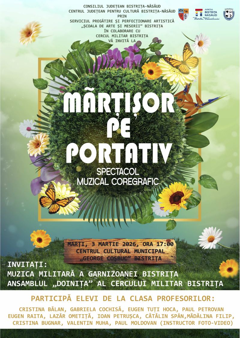 Consiliul Județean Bistrița-Năsăud, Centrul Județean pentru Cultură Bistrița-Năsăud și Serviciul Pregătire și Perfecționare Artistică „Școala de Arte și Meserii” Bistrița, în colaborare cu Cercul Militar Bistrița, vă invită la spectacolul Mărțișor pe Portativ. Este o celebrare muzical-coregrafică dedicată primăverii și tradițiilor românești.