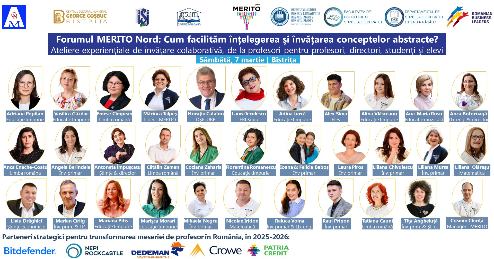 Peste 300 de profesori, directori, studenţi şi elevi de profil pedagogic, din zona de Nord şi din ţară, sunt așteptaţi să participe gratuit la prima ediţie a Forumului MERITO Nord. Tema ediției: „Cum facilităm înţelegerea şi învăţarea conceptelor abstracte?