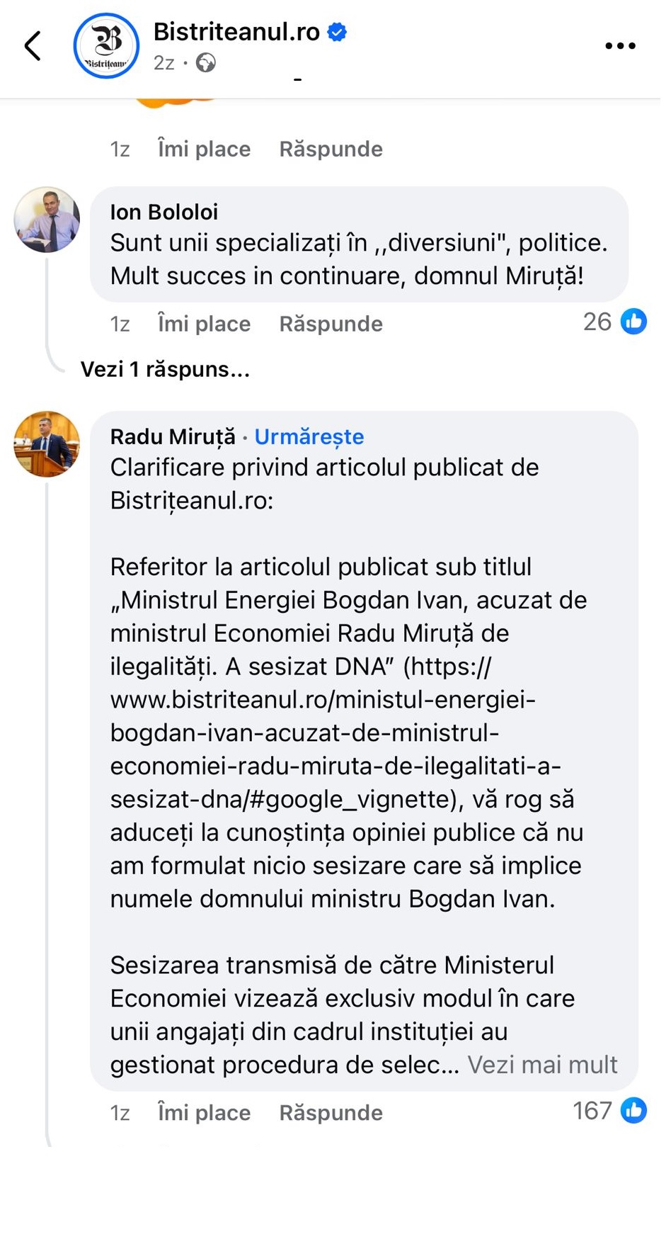 Într-un comentariu lăsat pe pagina de Facebook a ziarului local Bistrițeanul, ministrul Economiei Radu Miruță a ținut să clarifice faptul că sesizarea la DNA nu l-a vizat pe ministrul Bogdan Ivan, ci pe alți angajați din cadrul ministerului.