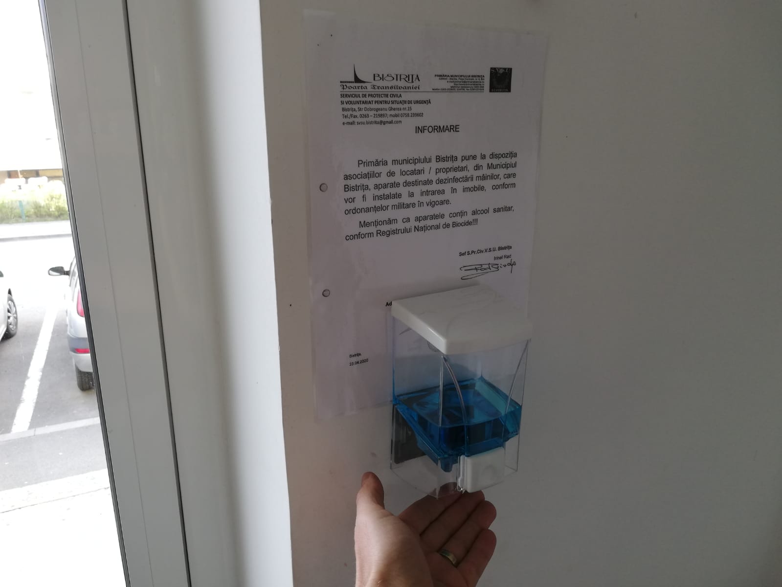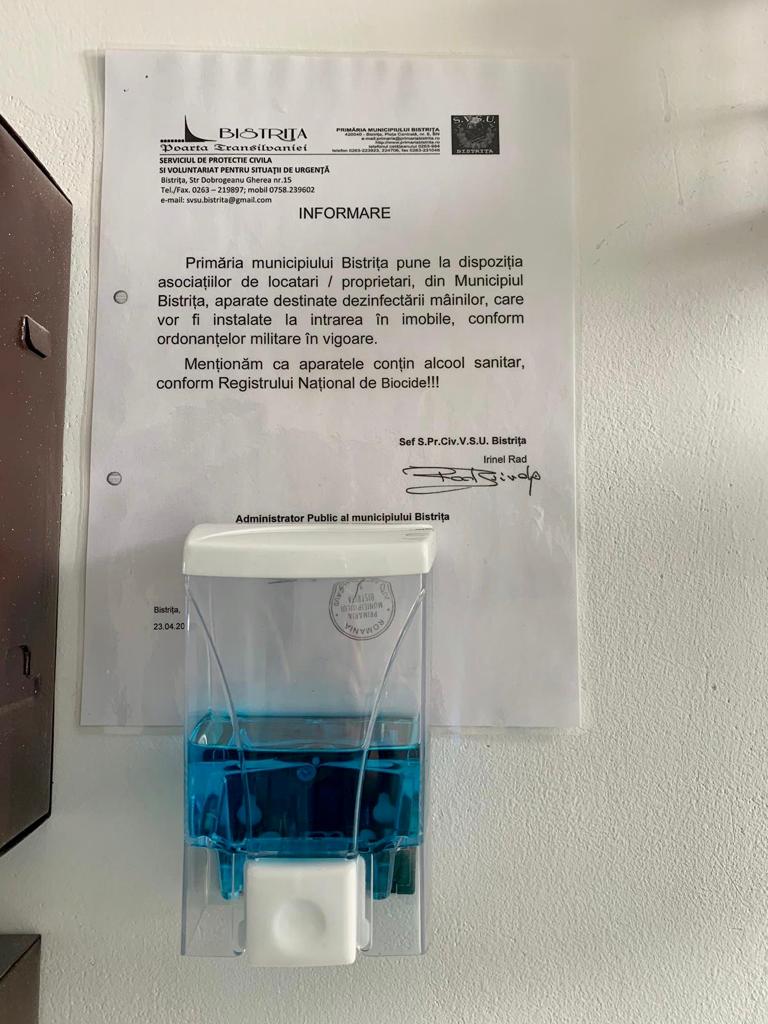 „Noi am comandat 1.500 de dozatoare. Doar că au sosit numai 1.000. În blocurile administrate de noi, respectiv locuințele sociale și ANL, le-am montat noi. Celelalte le-am distribuit deja administratorilor asociațiilor de proprietari, și au spus că și le montează ei la intrare pe scară. Le-am dat și spirt sanitar să pună în ele. Dacă montam noi în cele 1.500 de scări dura foarte mult. Așa fiecare și le montează mult mai repede și devin operative imediat. Când ne sosesc celelalte 500, le distribuim de urgență. Stăm de 3 săptămâni după ele și acum când au sosit, nu ne-au adus decât 1.000 din 1.500 comandate. Dar furnizorul ne-a asigurat că săptămâna viitoare vor sosi și celelalte 500”, a explicat Cristian Niculae, viceprimarul Bistriței.